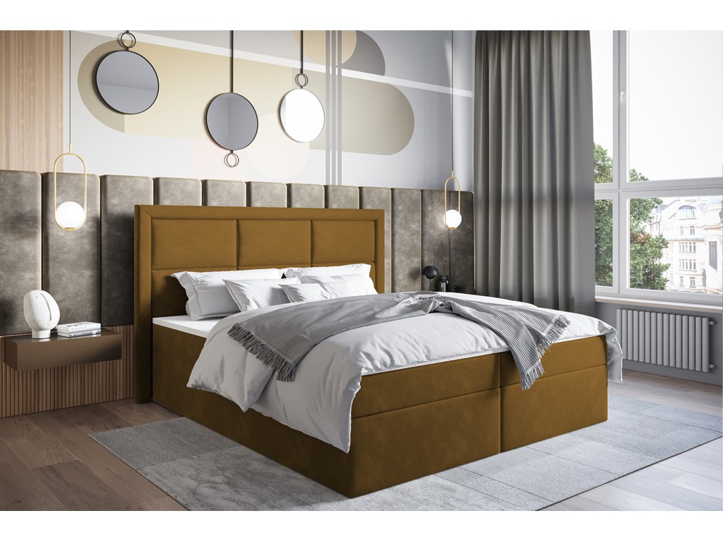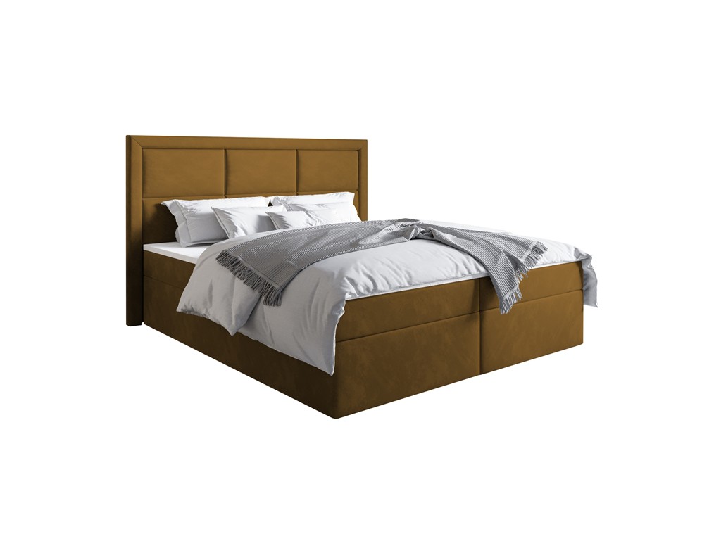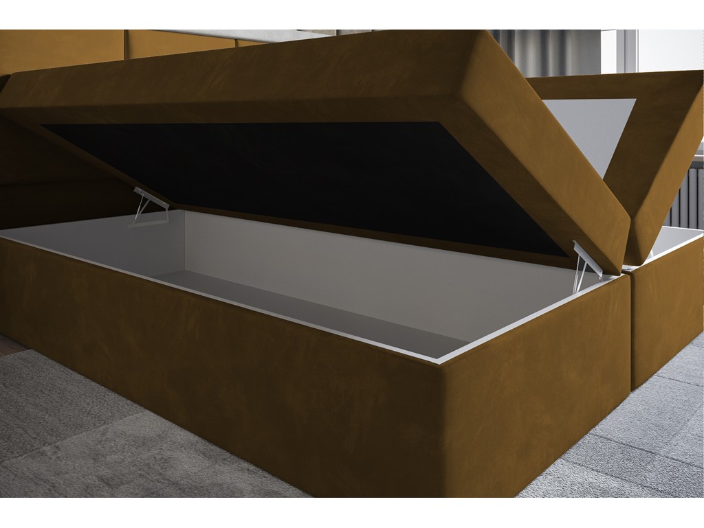 Łóżko Asti w rozmiarze 140 cm to kompaktowe łóżko kontynentalne z pikowanym wezgłowiem, idealne do mniejszych sypialni. Aksamitna w dotyku, miodowa tkanina Monolith 48 dodaje wnętrzu ciepła, elegancji i przytulności. Wbudowany materac bonelowy oraz pianka o zwiększonej gęstości zapewniają komfortowy sen, a dwa pojemniki na pościel zwiększają funkcjonalność łóżka.