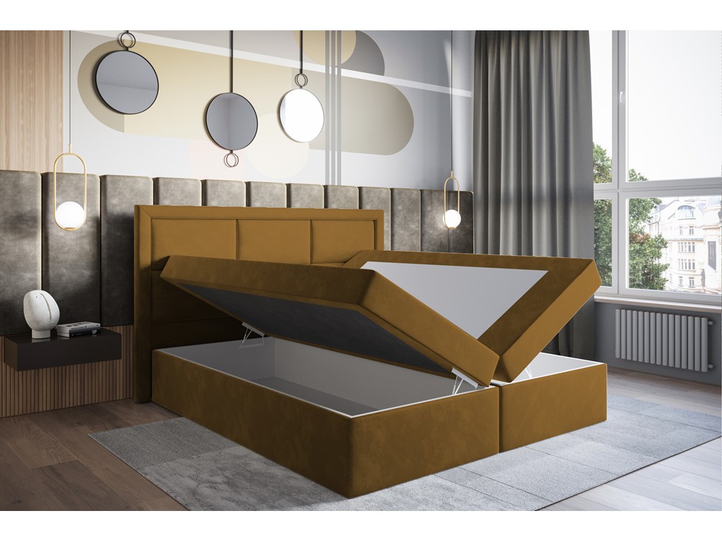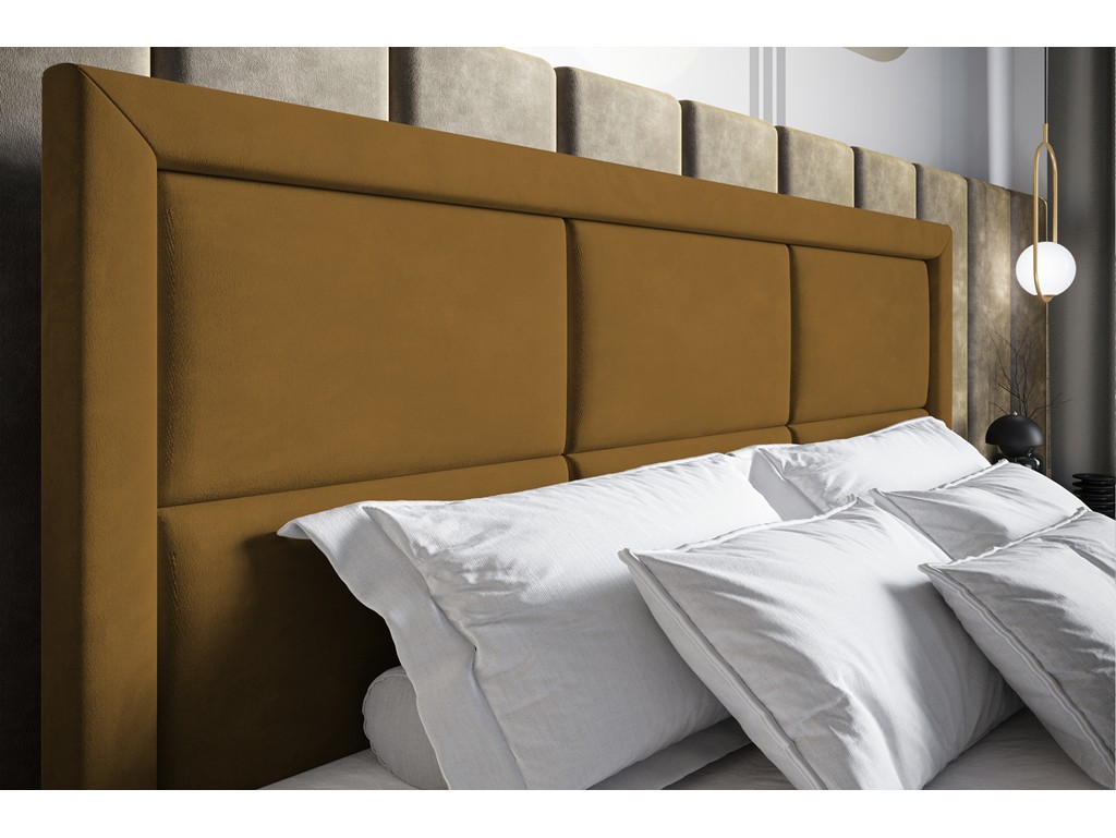 Łóżko Asti w rozmiarze 160 cm to funkcjonalne łóżko kontynentalne z pikowanym wezgłowiem, idealne do średnich sypialni. Aksamitna w dotyku, miodowa tkanina Monolith 48 nadaje wnętrzu ciepłego i eleganckiego charakteru. Materac bonelowy oraz pianka o zwiększonej gęstości zapewniają komfortowy, stabilny sen, a dwa pojemniki na pościel zwiększają praktyczność łóżka.