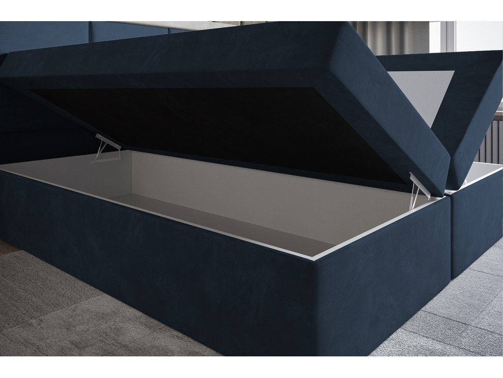 Łóżko Asti w rozmiarze 160 cm to funkcjonalne łóżko kontynentalne z pikowanym wezgłowiem, idealne do średnich sypialni. Aksamitna w dotyku, granatowa tkanina Monolith 77 nadaje wnętrzu elegancji i nowoczesnego charakteru. Materac bonelowy oraz pianka o zwiększonej gęstości zapewniają komfortowy i stabilny sen. Dwa pojemniki na pościel ułatwiają przechowywanie i organizację przestrzeni.