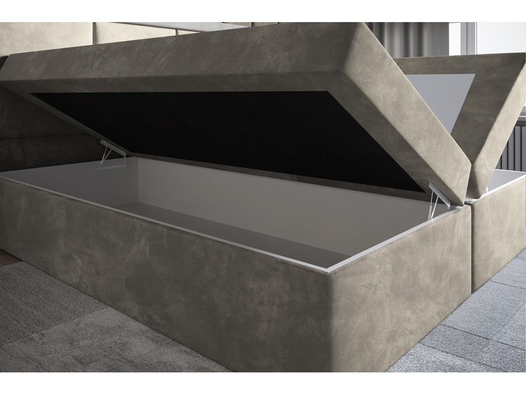 Dwa pojemniki na pościel ułatwiają utrzymanie porządku, a kontynentalna konstrukcja zapewnia komfort i stabilność podczas snu.