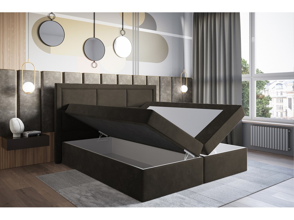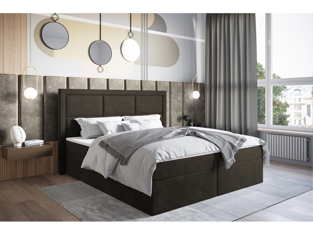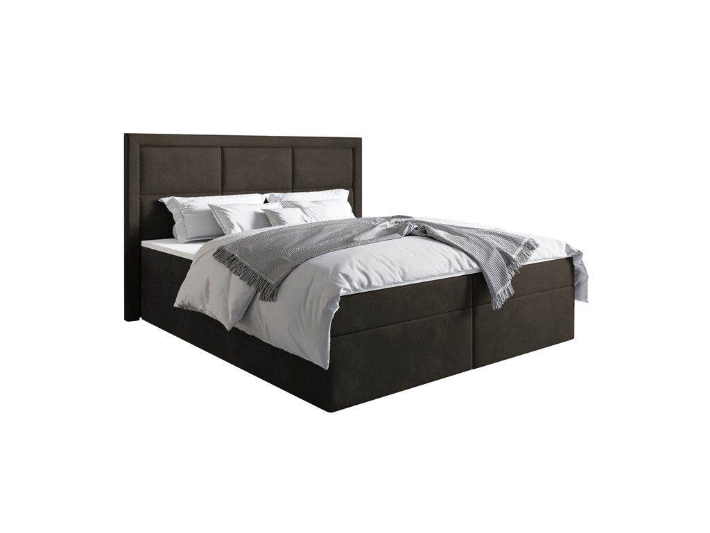 Łóżko kontynentalne Asti w rozmiarze 160 cm łączy elegancję z komfortem. Aksamitna tkanina Riviera 26 w ciemnym brązie wprowadza do sypialni przytulną atmosferę, a dwa pojemniki na pościel ułatwiają organizację przestrzeni. Materac bonelowy zapewnia stabilny i wygodny sen, a konstrukcja z drewna sosnowego gwarantuje trwałość.