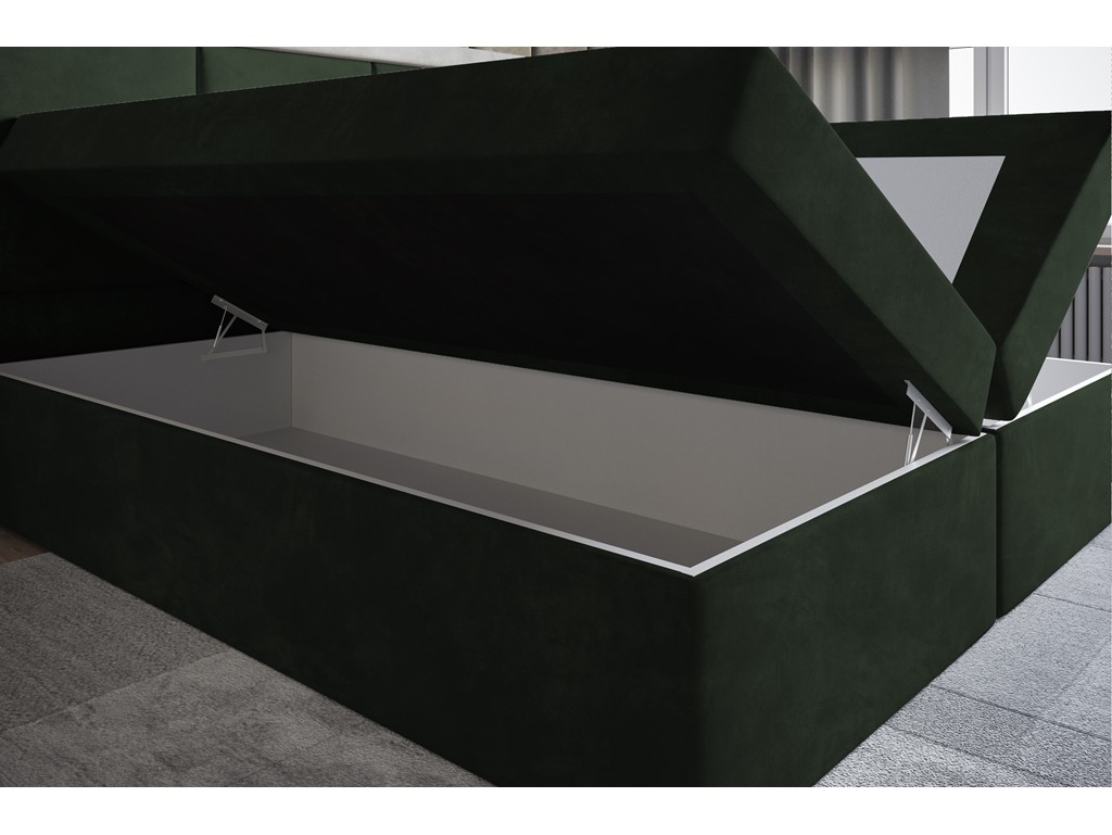 Ciemnozielona tkanina Riviera 38 nadaje wnętrzu wyrafinowanego charakteru, a dwa pojemniki na pościel zwiększają funkcjonalność.