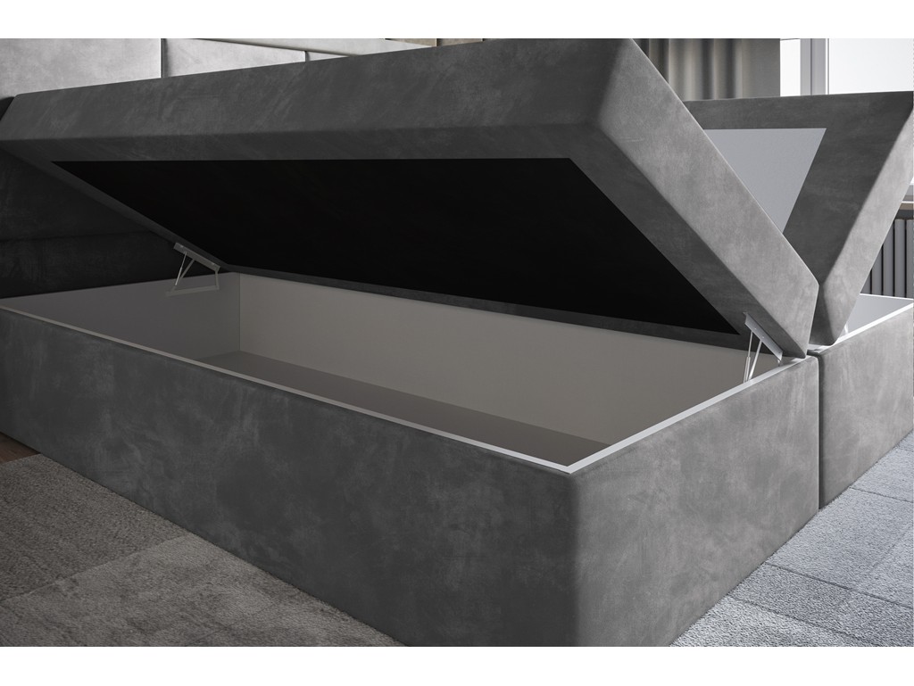Jasnoszary kolor tkaniny Riviera 82 wprowadza elegancję i subtelny połysk, a dwa pojemniki na pościel zwiększają funkcjonalność.