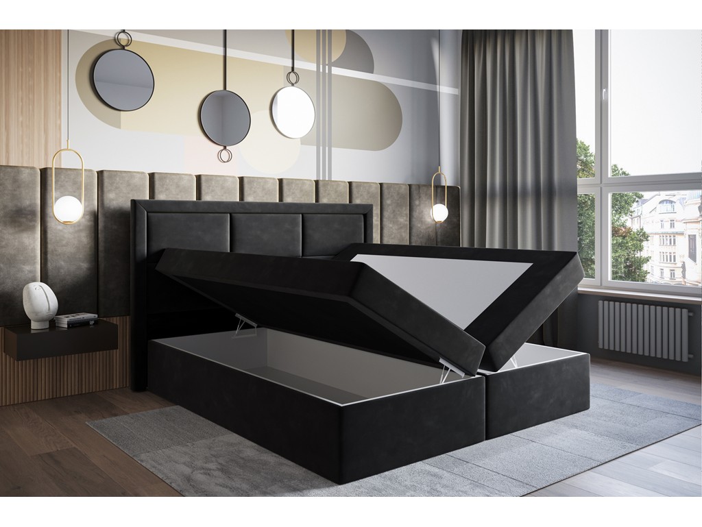 Czarna tkanina Riviera 100 nadaje wnętrzu wyrafinowany charakter, a tapicerowane wezgłowie zapewnia komfort przy oparciu.