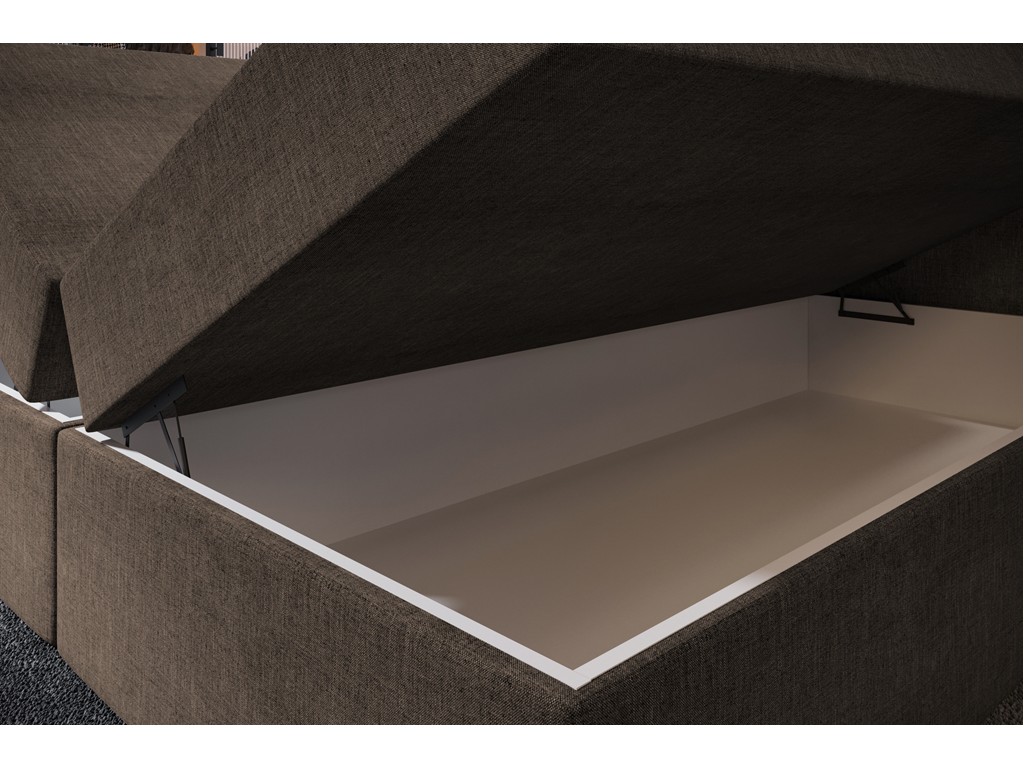 Łóżko Nori w rozmiarze 160 cm to funkcjonalny model kontynentalny, idealny do średnich sypialni. Tkanina Sawana 25 w ciepłym brązie wyróżnia się subtelnym, równym splotem i przyjemną strukturą. Komfort snu zapewnia materac bonelowy oraz pianka o zwiększonej gęstości, a dwa pojemniki na pościel zwiększają praktyczność mebla.