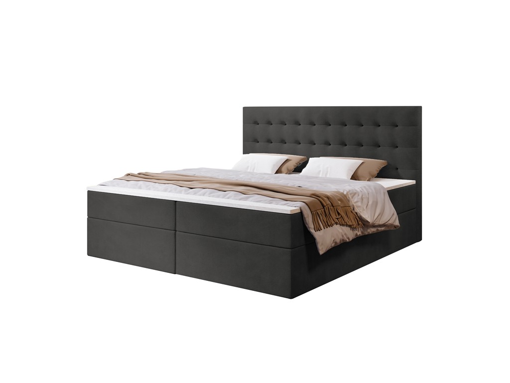 Łóżko Nori w rozmiarze 180 cm to nowoczesne, komfortowe łóżko kontynentalne z pikowanym zagłówkiem. Stalowa tkanina Kronos 22 ma miękką, pluszową strukturę z subtelnym cieniowaniem. Wbudowany materac bonelowy z pianką o zwiększonej gęstości zapewnia stabilny sen, a dwa pojemniki na pościel w białym laminacie dodają praktyczności i porządku.