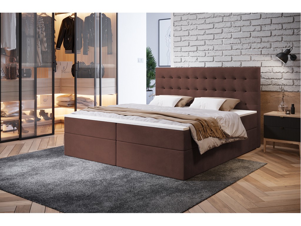 Łóżko Nori w rozmiarze 160 cm to komfortowe, nowoczesne łóżko kontynentalne z pikowanym zagłówkiem. Tkanina Kronos 29 w odcieniu łososiowym ma miękką, pluszową strukturę z subtelnym cieniowaniem, które zmienia wygląd pod wpływem światła i dotyku. Wbudowany materac bonelowy z pianką o zwiększonej gęstości zapewnia wygodny sen, a dwa pojemniki na pościel w białym laminacie zwiększają funkcjonalność i porządek.