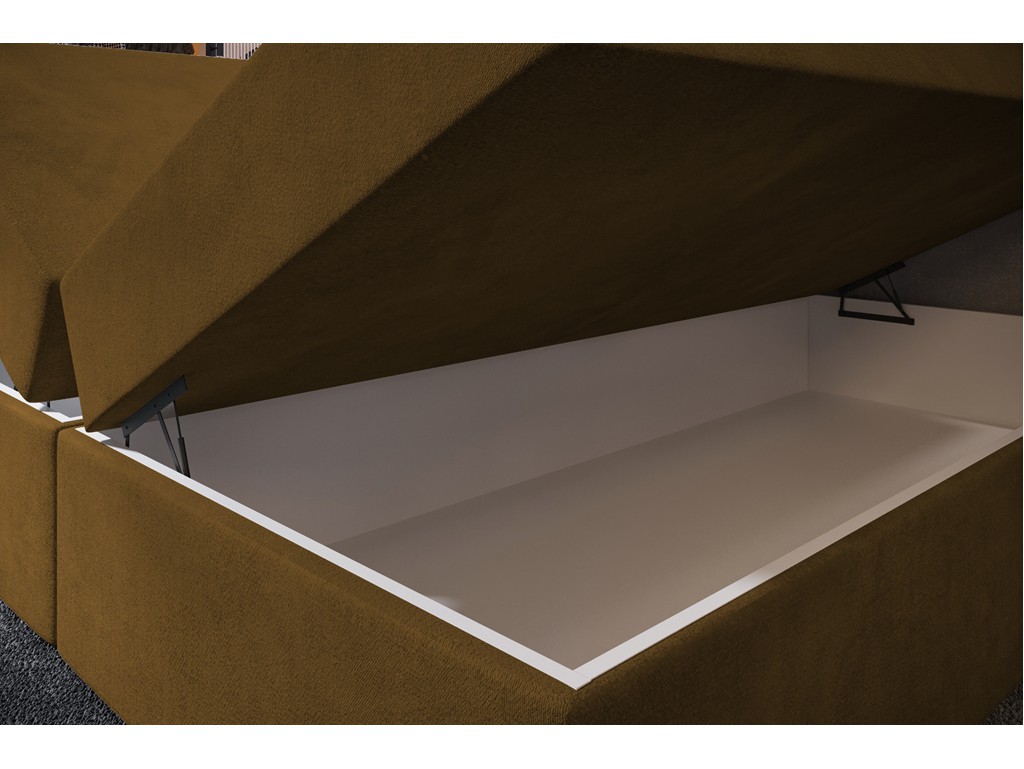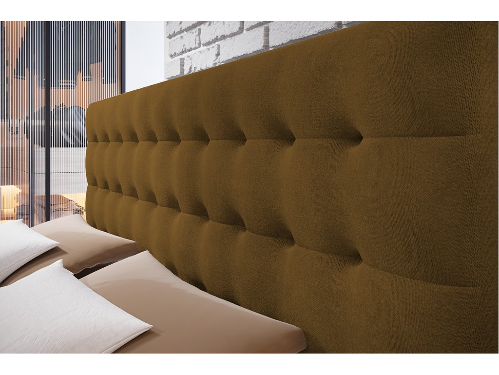 Łóżko Nori w rozmiarze 180 cm to nowoczesny model kontynentalny z pikowanym wezgłowiem, który łączy styl i wygodę w codziennym użytkowaniu. Tkanina Monolith 48 w odcieniu miodowym jest aksamitna, miękka i posiada subtelny połysk z efektem melanżowego cieniowania, co dodaje wnętrzu przytulności i charakteru. Wbudowany materac bonelowy z pianką o zwiększonej gęstości zapewnia stabilne podparcie i komfortowy sen. Dwa pojemniki na pościel w białym laminacie zwiększają funkcjonalność przestrzeni.