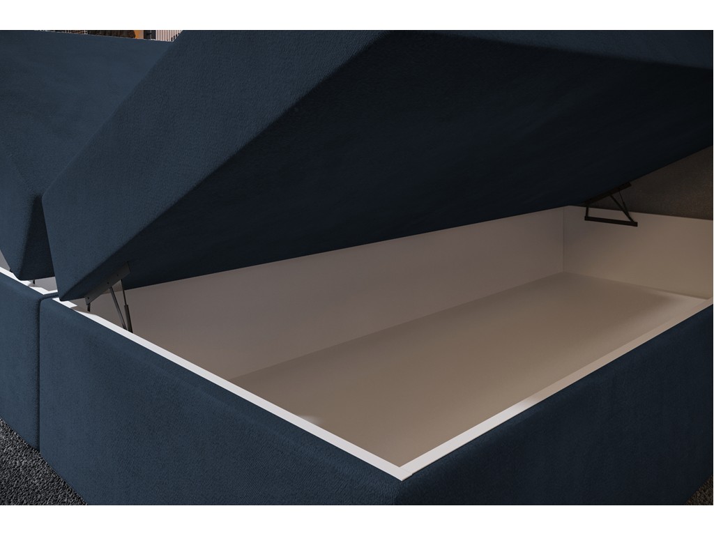 Granatowa tapicerka wprowadza głębię i elegancję aranżacji, a kontynentalna konstrukcja zapewnia wygodny sen.