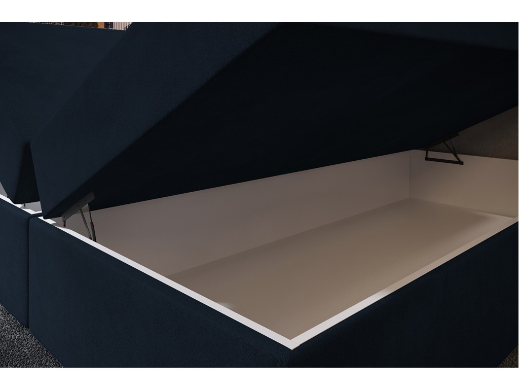 Łóżko kontynentalne Nori w rozmiarze 140 cm to kompaktowy model idealny do mniejszych sypialni. Tkanina Monolith 79 w kolorze ciemnego granatu zapewnia aksamitną miękkość i elegancki delikatny połysk. Wbudowany materac bonelowy oraz pianka o zwiększonej gęstości gwarantują komfortowy sen, a dwa pojemniki na pościel zwiększają funkcjonalność bez zajmowania dodatkowej przestrzeni.
