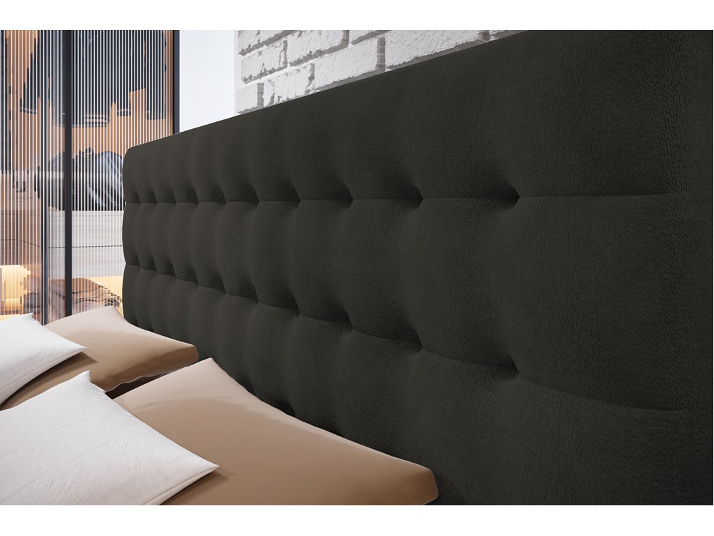 Łóżko kontynentalne Nori w rozmiarze 140 cm to funkcjonalny model do mniejszych sypialni, tapicerowany welurem Kronos 34 w odcieniu ciemnego szarego. Miękka, pluszowa tkanina z delikatnym cieniowaniem nadaje wnętrzu elegancki charakter, a wbudowany materac bonelowy z pianką o zwiększonej gęstości zapewnia stabilne podparcie podczas snu.