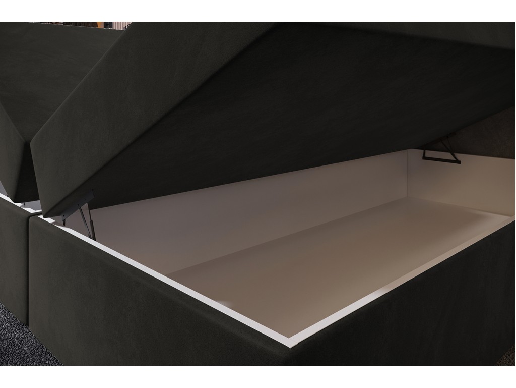 Ciemnoszara tkanina Kronos 34 wprowadza spokojny, elegancki akcent, a pojemniki na pościel ułatwiają organizację przestrzeni.