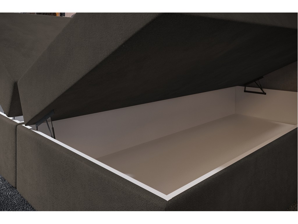 Łóżko Nori w rozmiarze 140 cm idealnie sprawdzi się w kompaktowych sypialniach. Tkanina Monolith 20 w szaro-brązowym odcieniu jest aksamitna, miękka i elegancka, nadając wnętrzu przytulny i nowoczesny charakter. Wbudowany materac bonelowy z pianką o zwiększonej gęstości zapewnia komfortowy i stabilny sen, a dwa pojemniki na pościel w białym laminacie zwiększają funkcjonalność i ułatwiają utrzymanie porządku w sypialni.