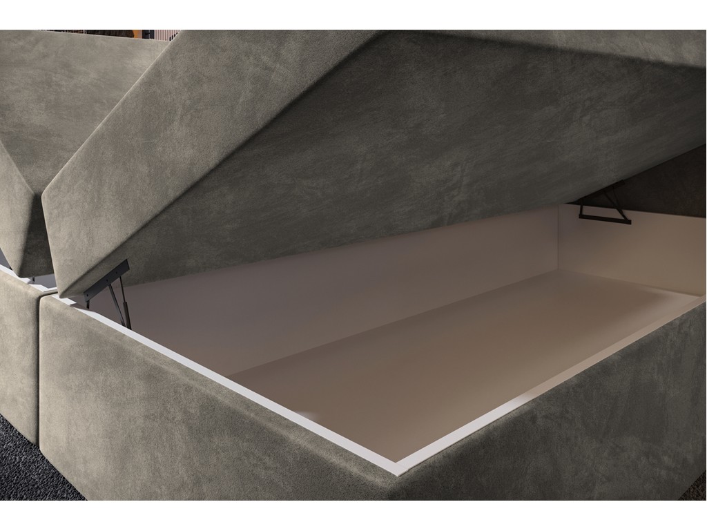 Szaro-beżowa tkanina Riviera 16 tworzy przytulny klimat, a dwa pojemniki na pościel pozwalają utrzymać porządek.