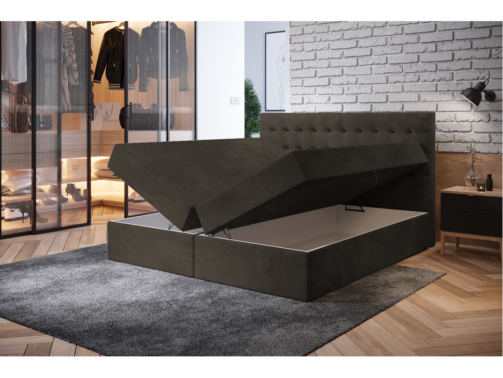 Łóżko Nori w rozmiarze 160 cm to elegancki model kontynentalny z tapicerowanym zagłówkiem, łączący nowoczesny design z komfortem użytkowania. Ciemnobrązowa tkanina Riviera 26 nadaje wnętrzu przytulny i luksusowy charakter, a miękka aksamitna powierzchnia zapewnia przyjemne wrażenia dotykowe. Wbudowany materac bonelowy z pianką o zwiększonej gęstości gwarantuje wygodny sen, a dwa pojemniki na pościel ułatwiają utrzymanie porządku w sypialni.