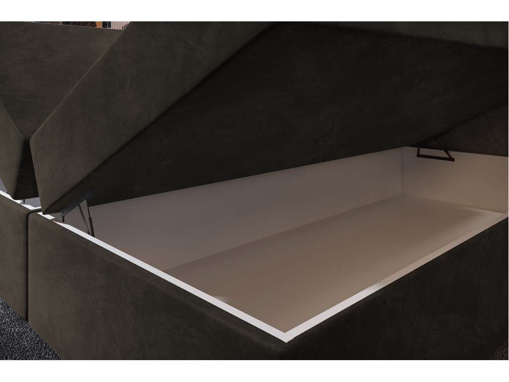 Ciemnobrązowa tkanina Riviera 26 dodaje ciepła i wyrafinowanego stylu, a dwa pojemniki na pościel pozwalają utrzymać porządek.