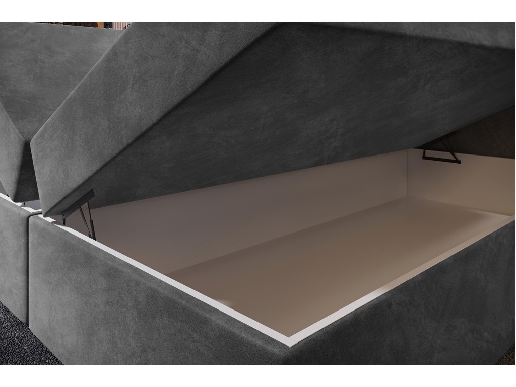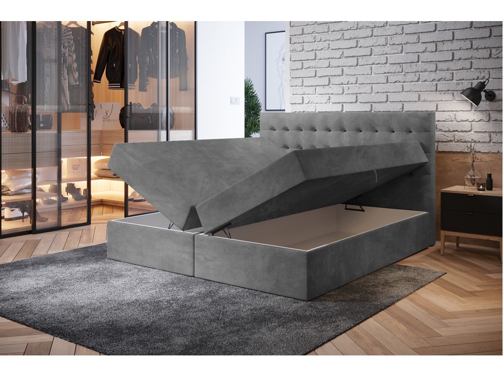 Pikowane wezgłowie podnosi komfort użytkowania, a aksamitna tkanina Riviera nadaje wnętrzu elegancki charakter.