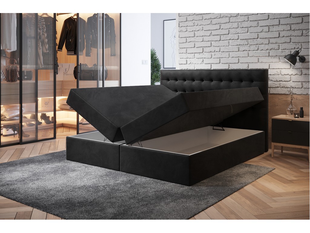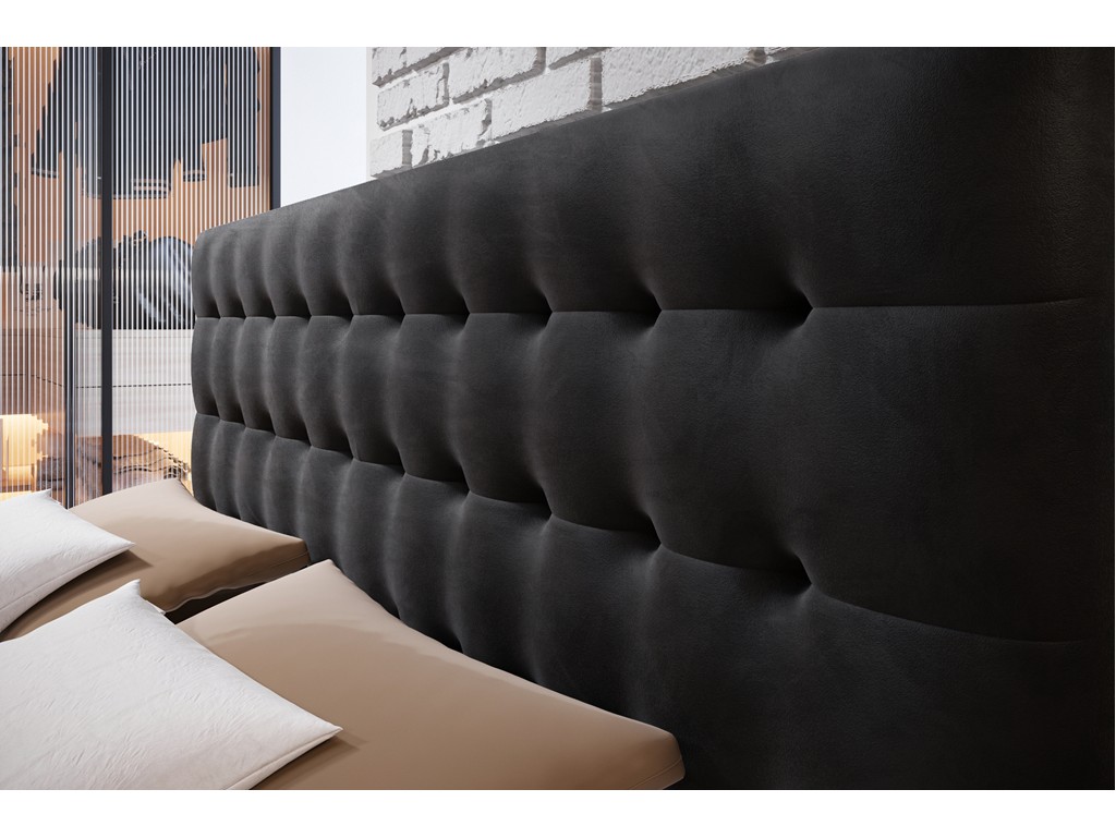 Łóżko Nori w rozmiarze 140 cm to nowoczesny model kontynentalny z pikowanym zagłówkiem, który łączy komfort z eleganckim designem. Czarna tkanina Riviera 100 jest aksamitna i przyjemna w dotyku, wprowadzając przytulny charakter do sypialni. Wbudowany materac bonelowy z pianką o zwiększonej gęstości zapewnia wygodny sen, a dwa pojemniki na pościel ułatwiają utrzymanie porządku.