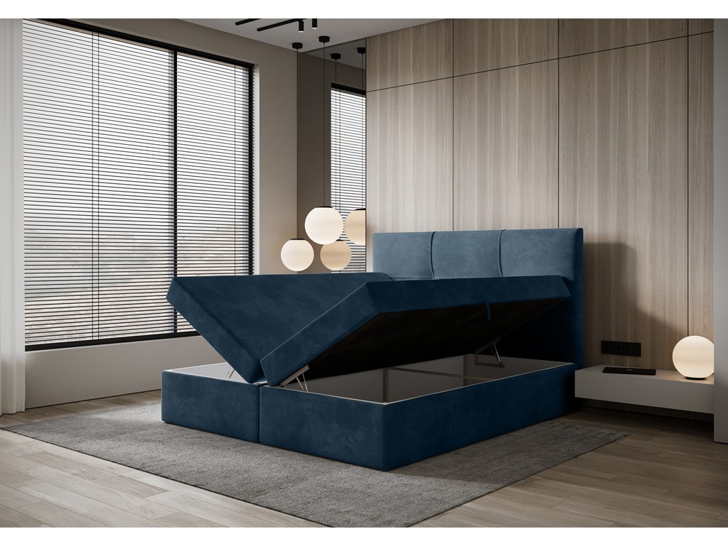 Łóżko kontynentalne Fado 1 w rozmiarze 160 cm w tkaninie Monolith 76 w niebieskim odcieniu lazurowym to elegancka propozycja do sypialni, łącząca styl i komfort. Tapicerowane wezgłowie z ozdobnymi przeszyciami zapewnia wygodne oparcie i estetyczne wykończenie, a wbudowane materace bonelowe gwarantują stabilne podparcie ciała.