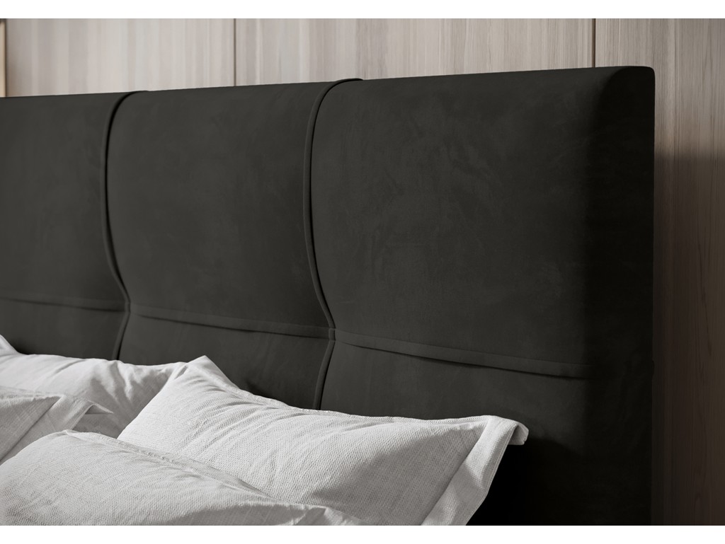 Tkanina Monolith wyróżnia się hydrofobowością i subtelnym efektem cieniowania, a ozdobne przeszycia zagłówka podkreślają elegancki wygląd łóżka.