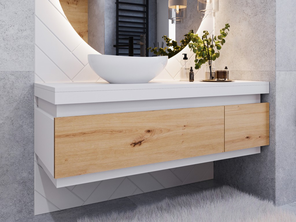 Szafka łazienkowa Seli 110 cm w kolorze biały mat / dąb lefkas to stylowe połączenie funkcjonalności i elegancji. Jasny, matowy korpus z frontami w dekorze dębu lefkas wprowadza do wnętrza harmonię i ciepło, jednocześnie optycznie powiększając przestrzeń. Idealna pod umywalkę nablatową, sprawdzi się w nowoczesnych i skandynawskich aranżacjach. Dostawa w 3-10 dni.