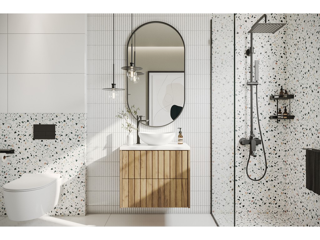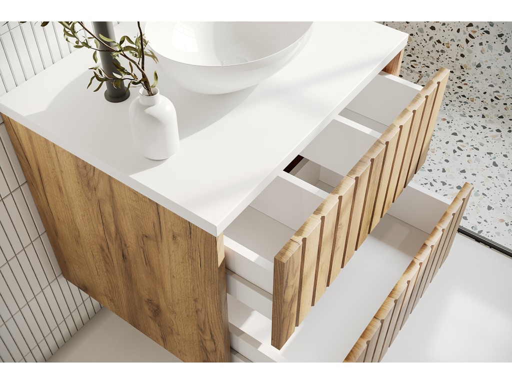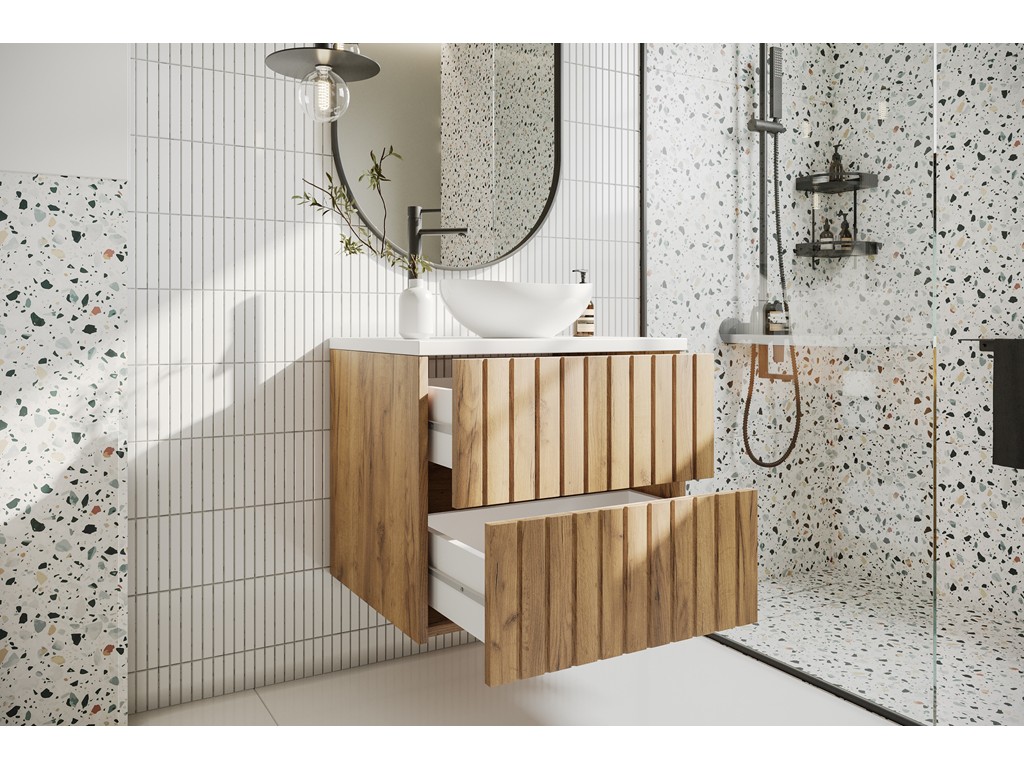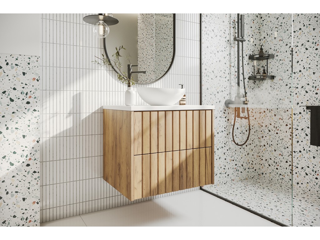 Szafka łazienkowa Ryfi 60 cm łączy naturalny urok drewna ze świeżością bieli. Ryflowane fronty MDF w dekorze złoty dąb współgrają z białym blatem, tworząc elegancki mebel w stylu modern natural. Idealna do małych i średnich łazienek - lekka, funkcjonalna i gotowa do montażu na ścianie. ⟵Zobacz całą kolekcję mebli Ryfi