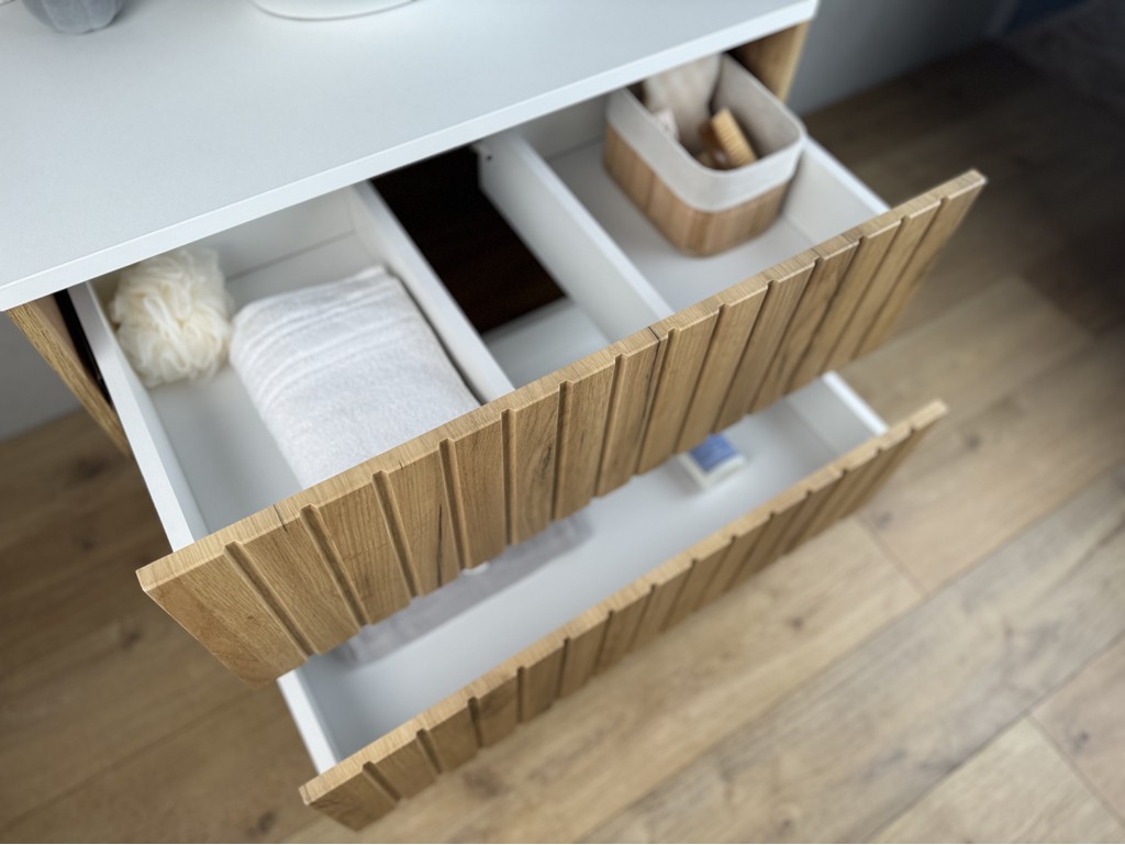 Ryflowane fronty podkreślają nowoczesny charakter mebla, a konstrukcja wisząca pozwala zachować porządek w łazience.