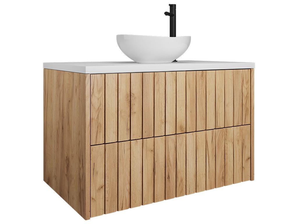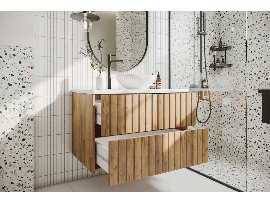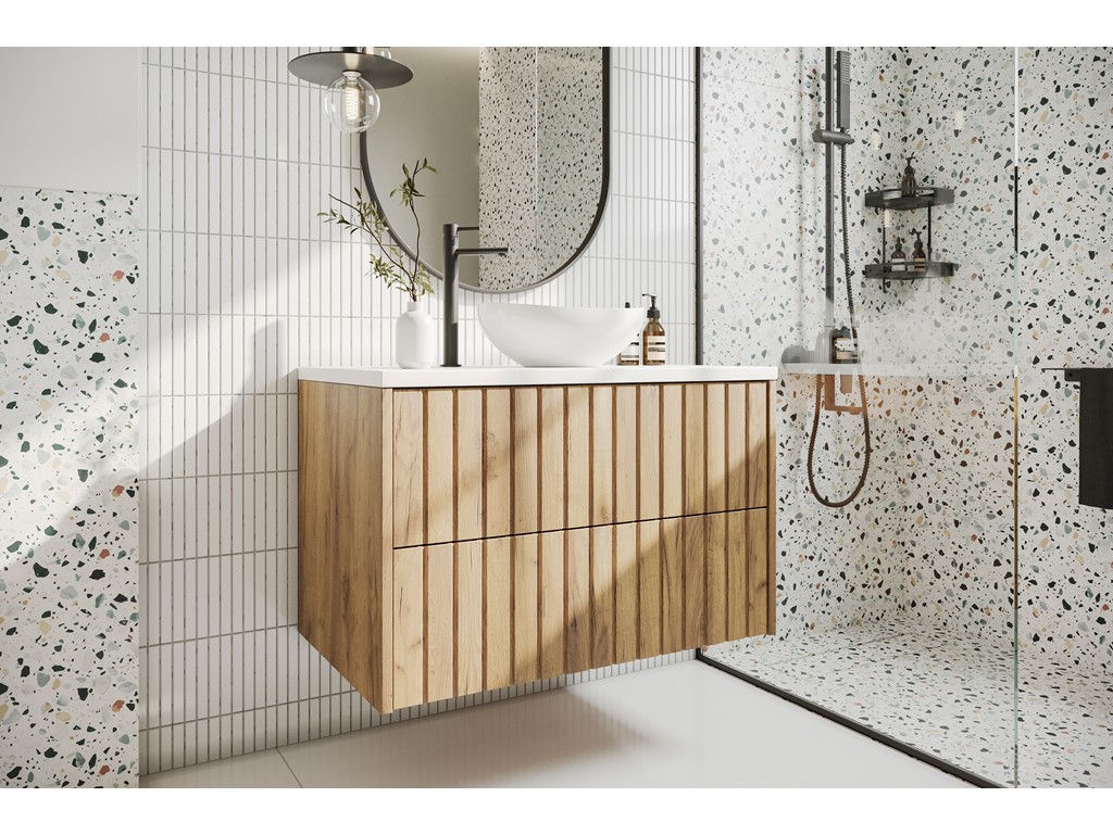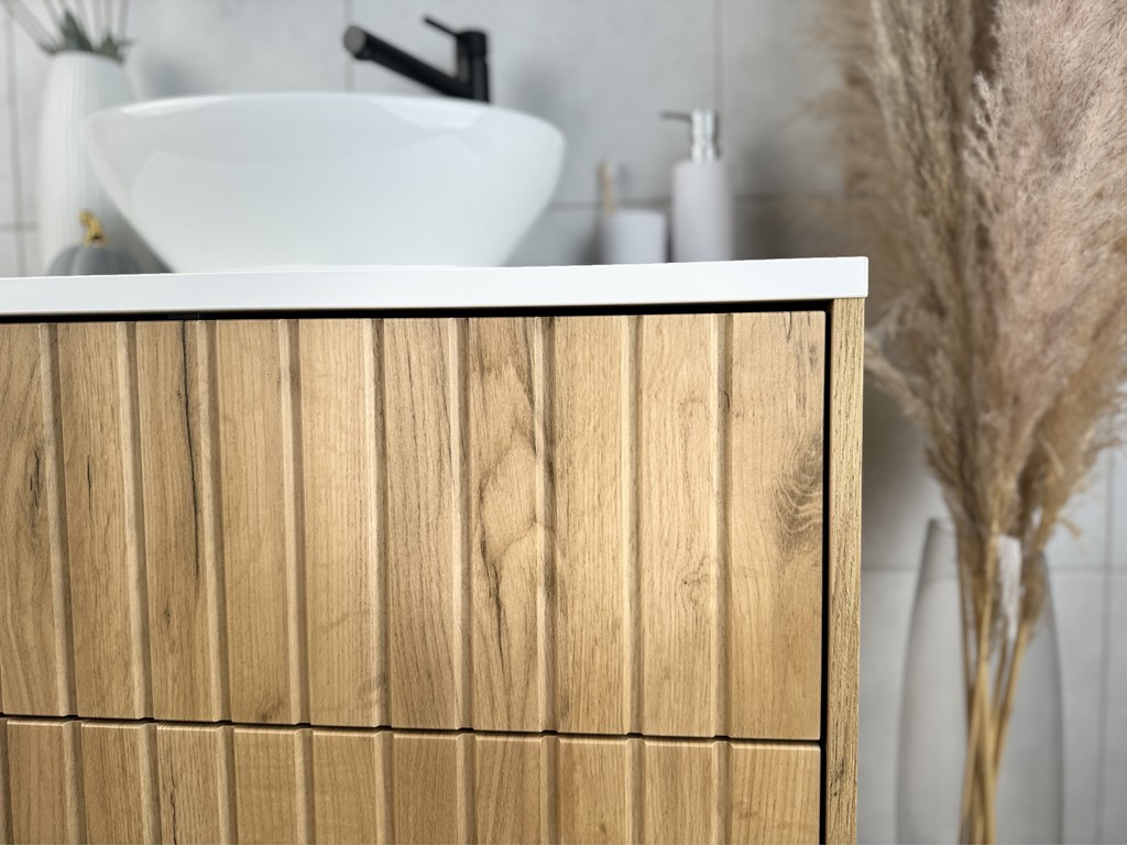 Szafka łazienkowa Ryfi 80 to połączenie funkcjonalności i elegancji. Ryflowane fronty w dekorze złoty dąb harmonijnie współgrają z białym korpusem, tworząc subtelną kompozycję o nowoczesnym charakterze. Mebel doskonale sprawdzi się w przestronnych łazienkach, w których liczy się ład, estetyka i wygoda użytkowania. ⟵Zobacz całą kolekcję mebli Ryfi