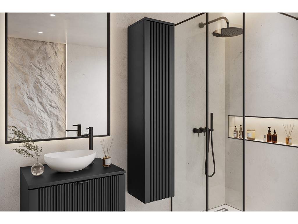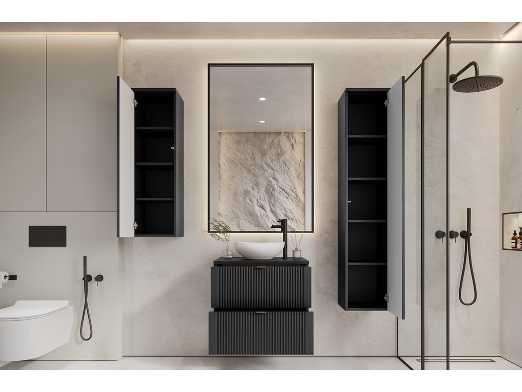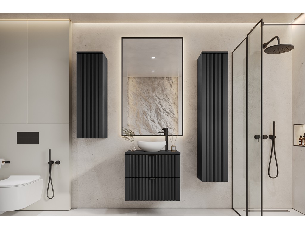 Zestaw mebli łazienkowych Daki 60 3 w czarnym odcieniu to propozycja dla osób, które cenią elegancję i funkcjonalność. W komplecie znajdują się: szafka pod umywalkę 60 cm, słupek 100 cm i słupek 150 cm - razem tworzą harmonijną i praktyczną zabudowę w stylu nowoczesnym lub loftowym. Wisząca forma ułatwia czyszczenie i dodaje wnętrzu lekkości. ⟵Zobacz całą kolekcję mebli Daki