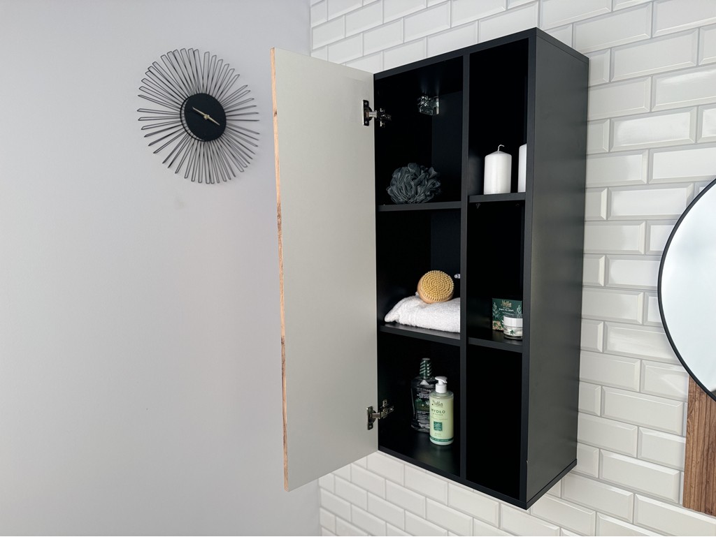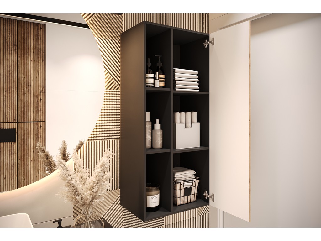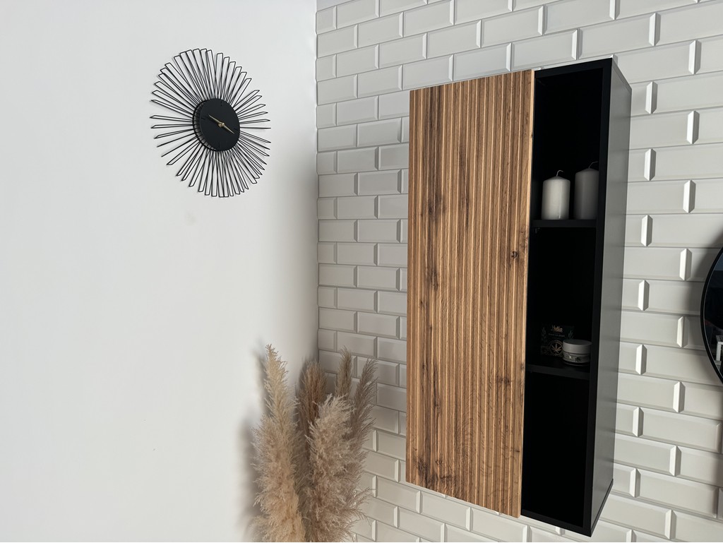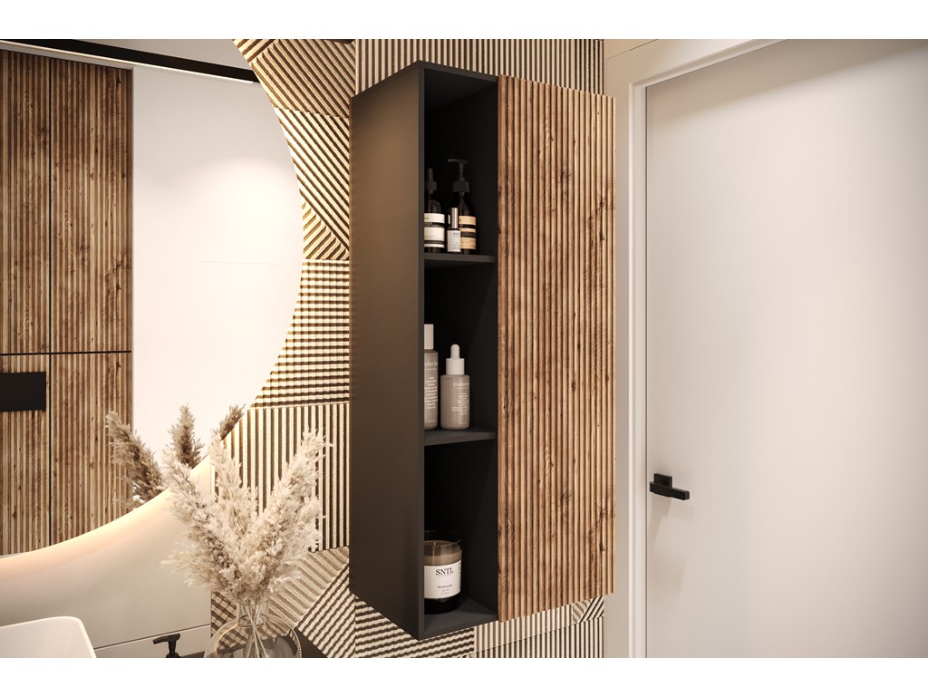 Słupek łazienkowy Wota łączy nowoczesny minimalizm z naturalnym akcentem drewna. Ryflowane fronty w dekorze dąb wotan i czarny matowy korpus tworzą elegancki duet, idealny do wnętrz w stylu loft lub modern. Mebel zapewnia dodatkowe miejsce na akcesoria i kosmetyki, a dostawa trwa od 3 do 10 dni. ⟵Zobacz całą kolekcję mebli Wota