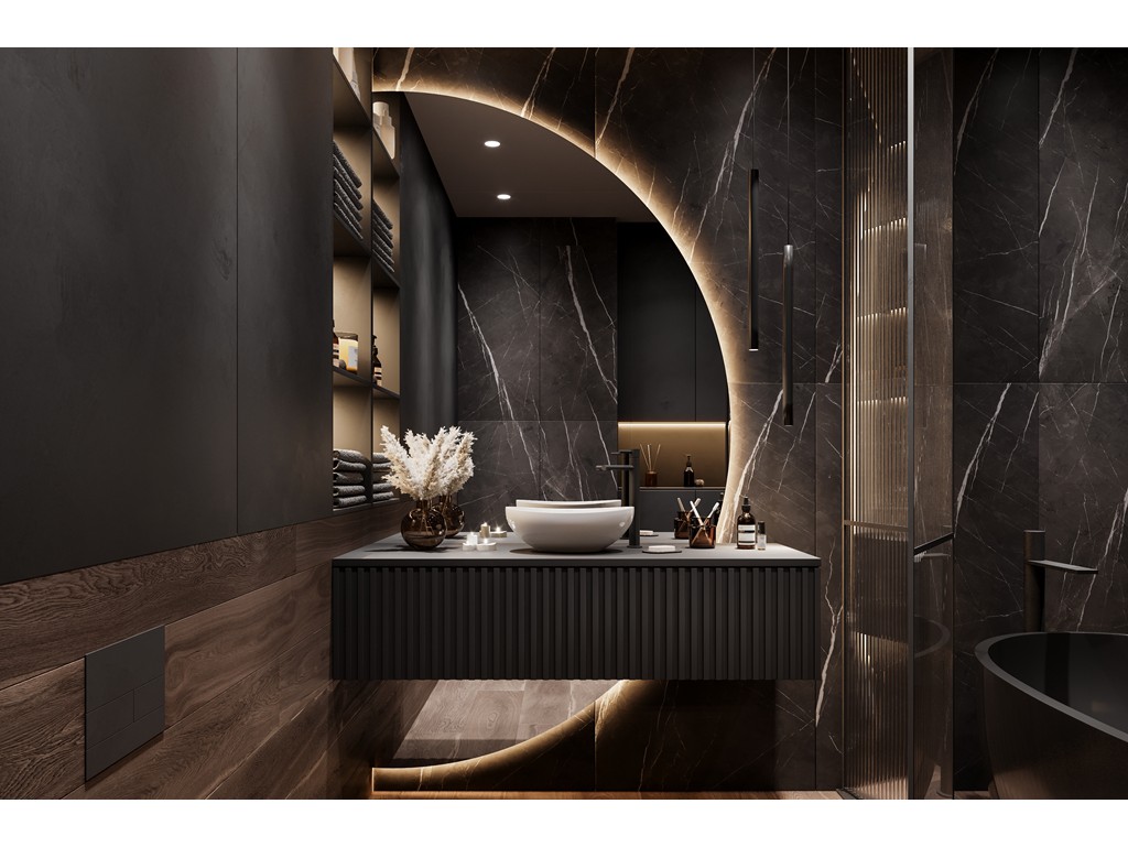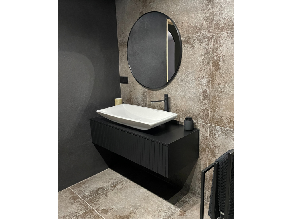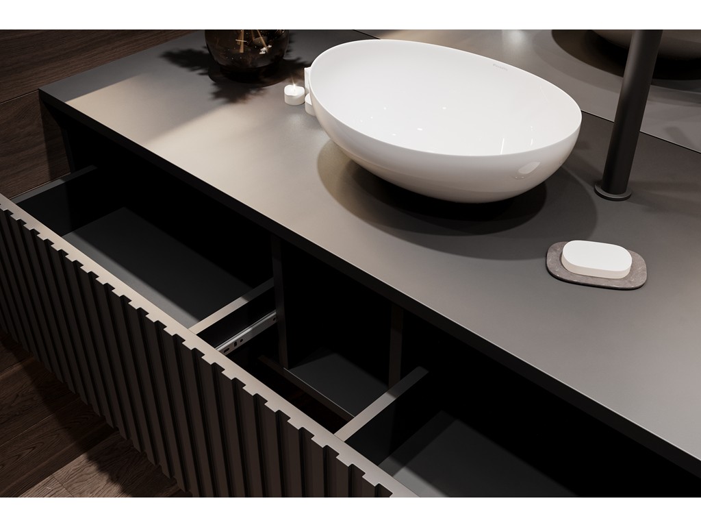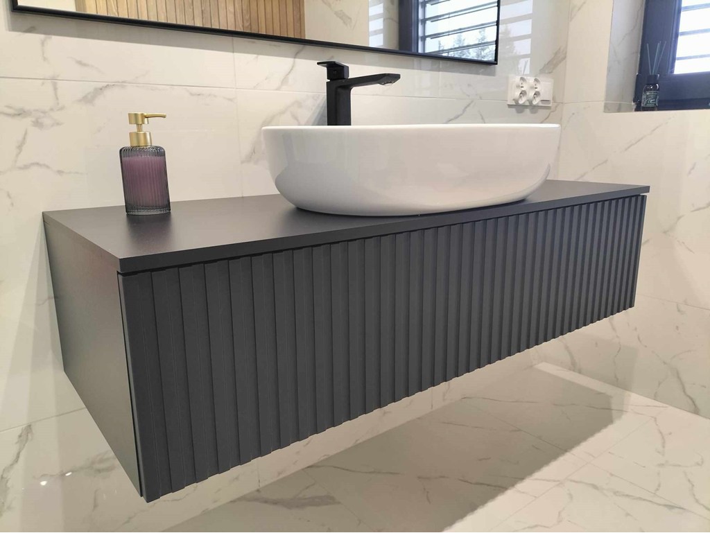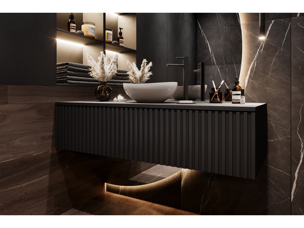 Ryflowane fronty i czarny mat wprowadzają do wnętrza subtelny luksus, a konstrukcja wisząca podkreśla lekkość aranżacji.