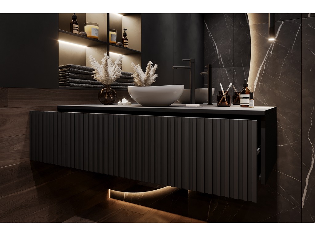Szafka łazienkowa Lore 120 czarny mat to propozycja dla miłośników nowoczesnej elegancji. Ryflowane fronty i głęboka matowa czerń nadają wnętrzu wyrafinowany charakter, a duża szuflada pozwala utrzymać porządek w łazience. Konstrukcja wisząca zapewnia lekkość formy i łatwe utrzymanie czystości pod meblem. ⟵Zobacz całą kolekcję mebli Lore