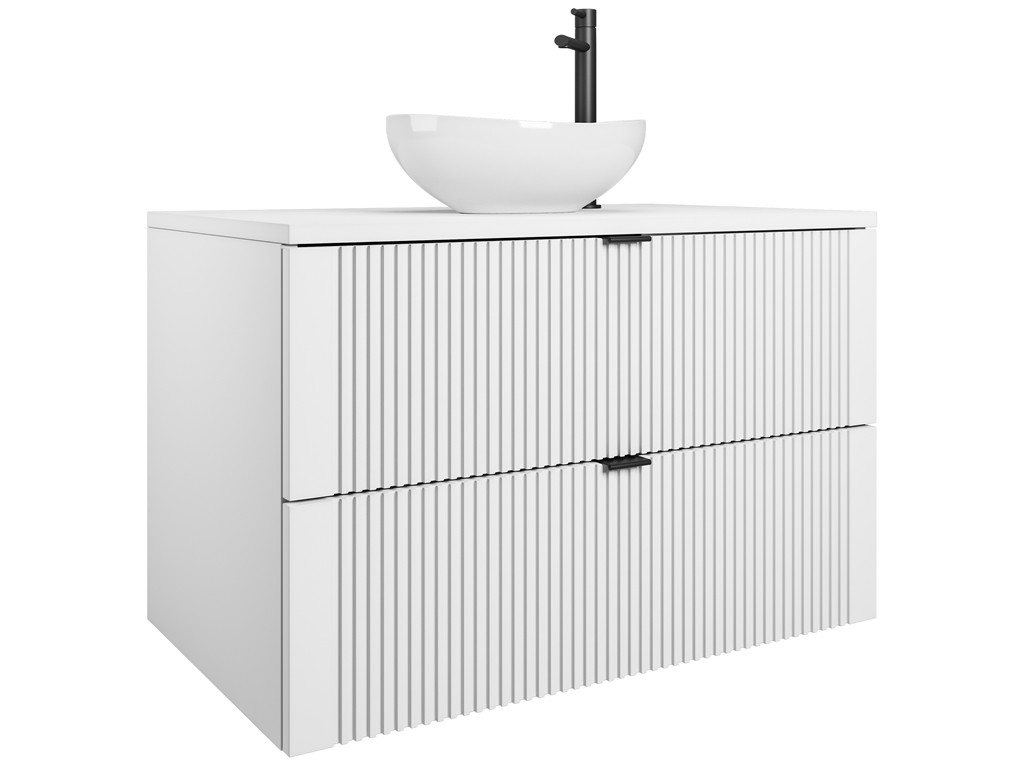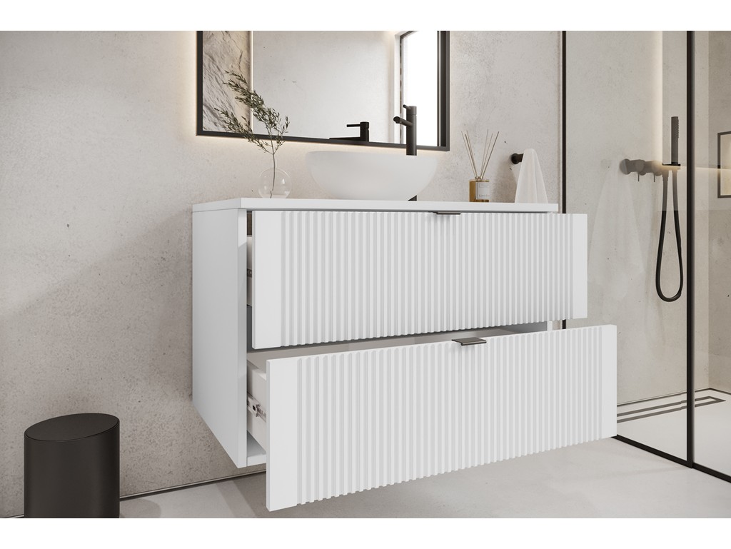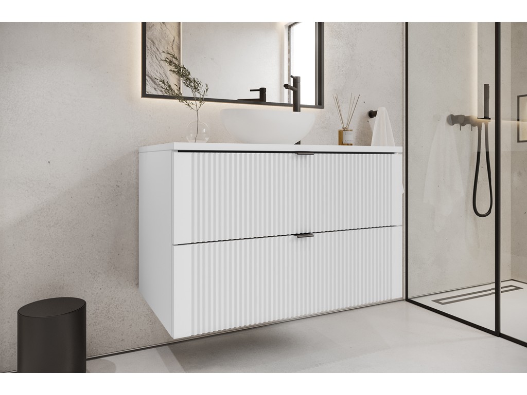 Gładki blat i pionowe ryflowania nadają wnętrzu lekkości, a forma wisząca sprzyja estetyce i higienie użytkowania.