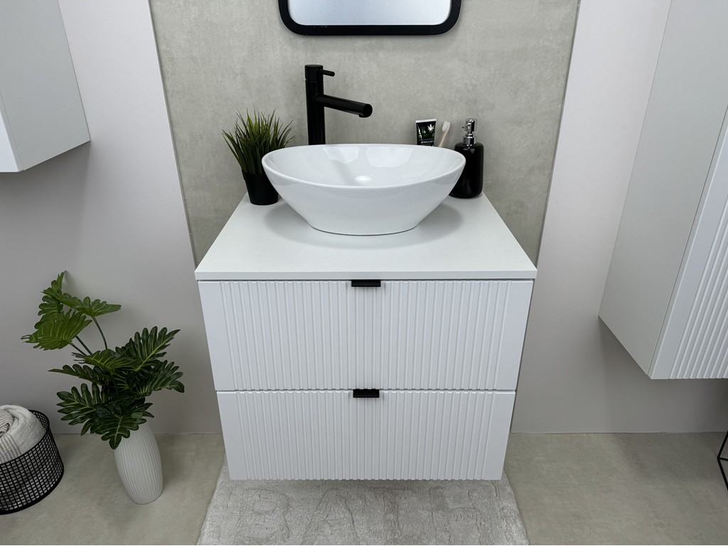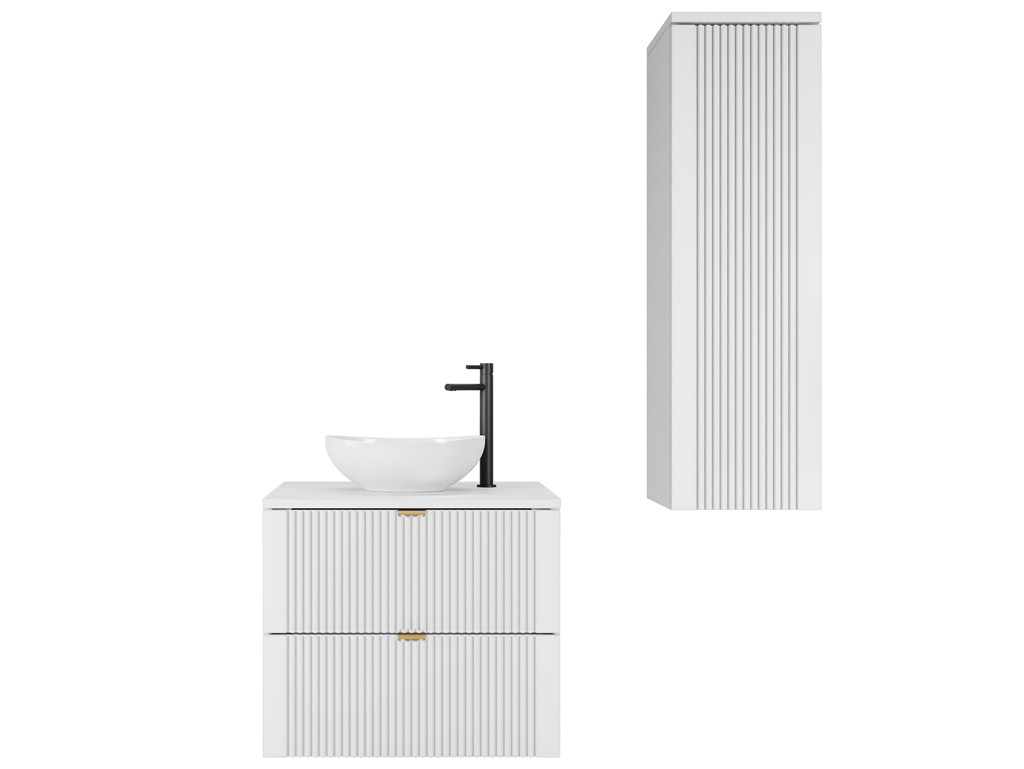 Zestaw Daki 60 1 w kolorze białym ze złotymi uchwytami łączy subtelną elegancję i praktyczność w kompaktowej formie. Komplet składa się z szafki 60 cm i słupka 100 cm - idealnych do małych i średnich łazienek, gdzie liczy się estetyka i porządek. Biel z ciepłym złotem tworzy harmonijne połączenie, a system wiszący dodaje lekkości i ułatwia utrzymanie czystości.