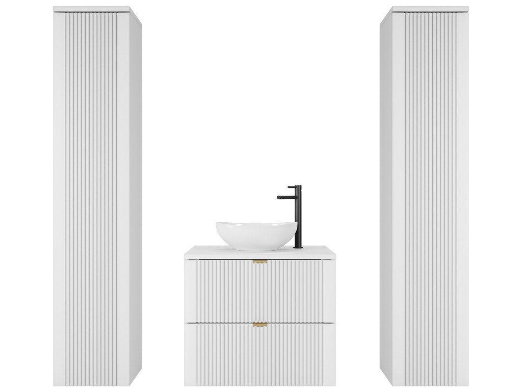 Zestaw mebli łazienkowych Daki 60 5 w kolorze biała perła ze złotymi uchwytami to harmonijne połączenie funkcjonalności i elegancji. W skład kompletu wchodzi szafka 60 cm oraz dwa wysokie słupki 150 cm, które tworzą symetryczną, pojemną kompozycję idealną do przestronnych łazienek. Ryflowane fronty i złote detale wprowadzają do wnętrza subtelny akcent luksusu.