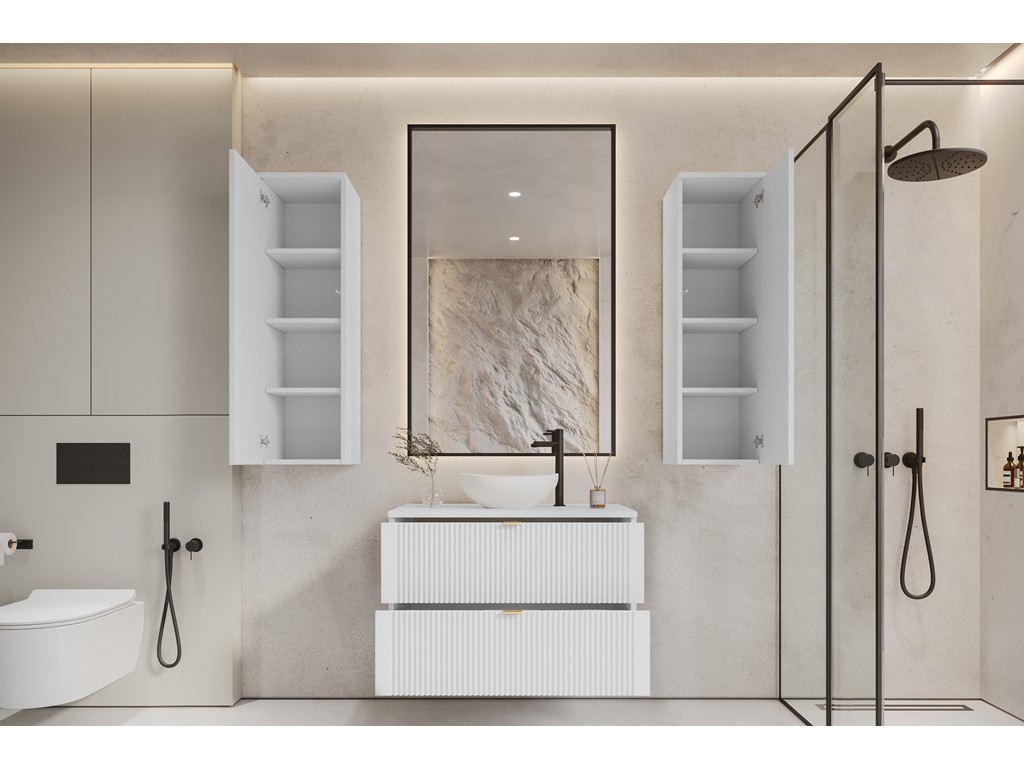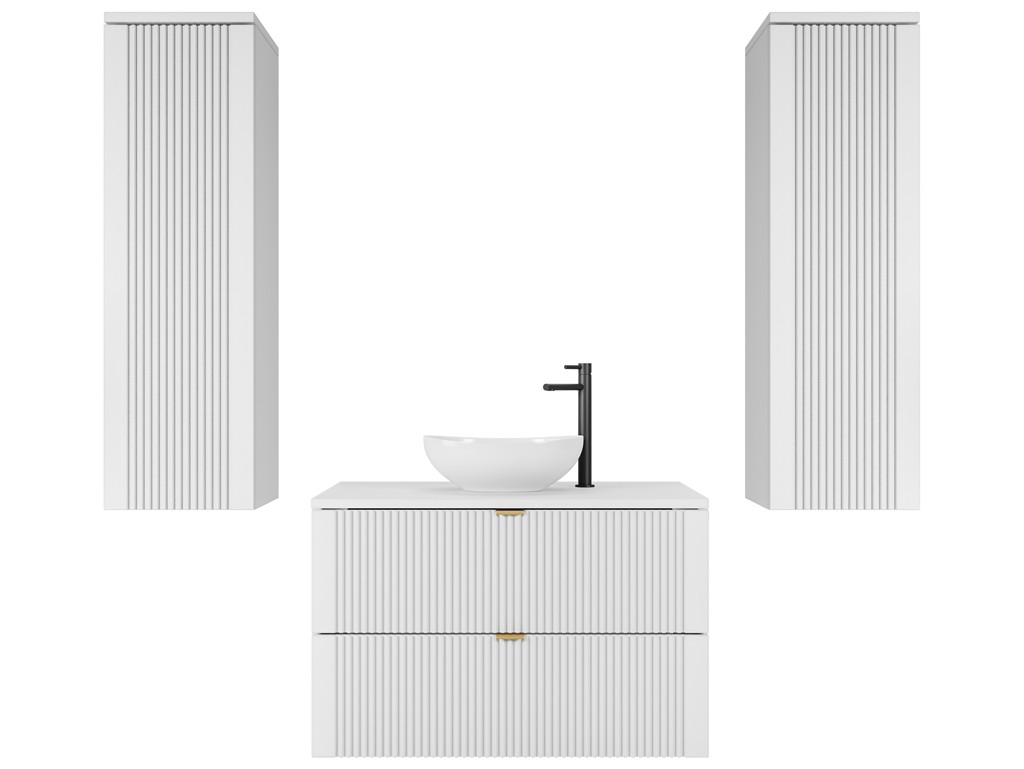 Zestaw Daki 80 4 w kolorze białej perły ze złotymi uchwytami to elegancka i funkcjonalna kompozycja mebli łazienkowych. Składa się z dwóch słupków o wysokości 100 cm oraz szafki 80 cm z blatem, tworząc harmonijny układ do średnich i większych wnętrz. Jasny odcień bieli i złote detale wprowadzają do łazienki subtelny luksus i poczucie porządku. ⟵Zobacz całą kolekcję mebli Daki