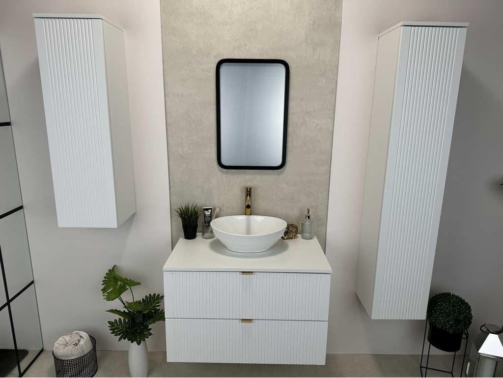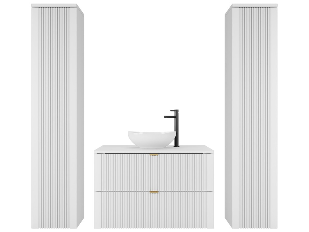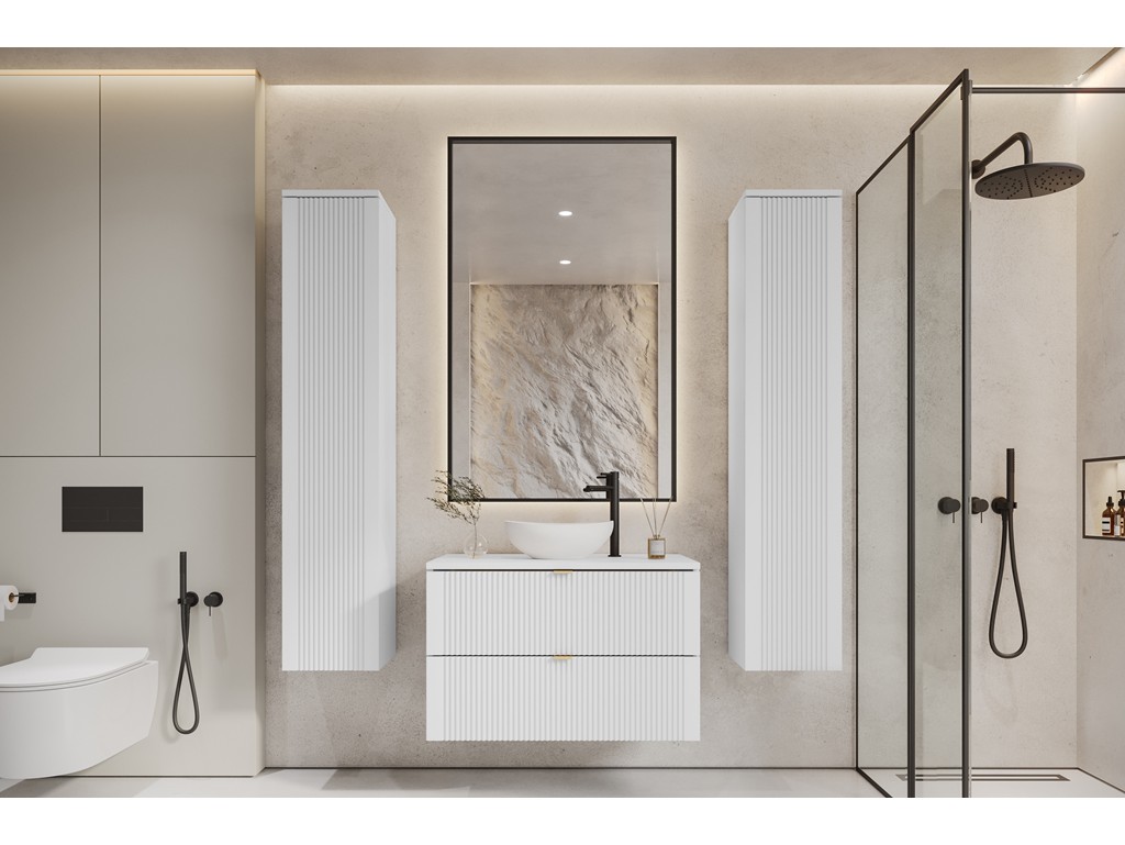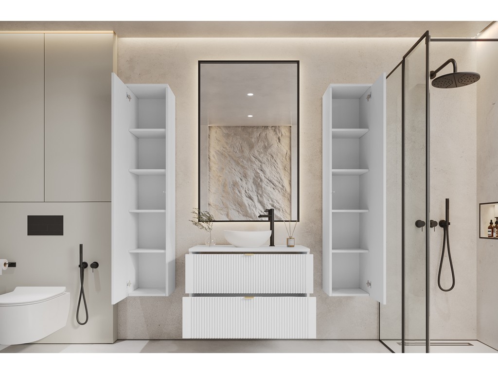 Dwa wysokie słupki pozwalają wygodnie uporządkować łazienkę, a ryflowane fronty nadają wnętrzu oryginalny rytm i głębię.