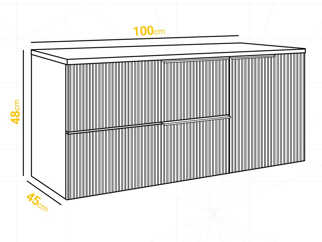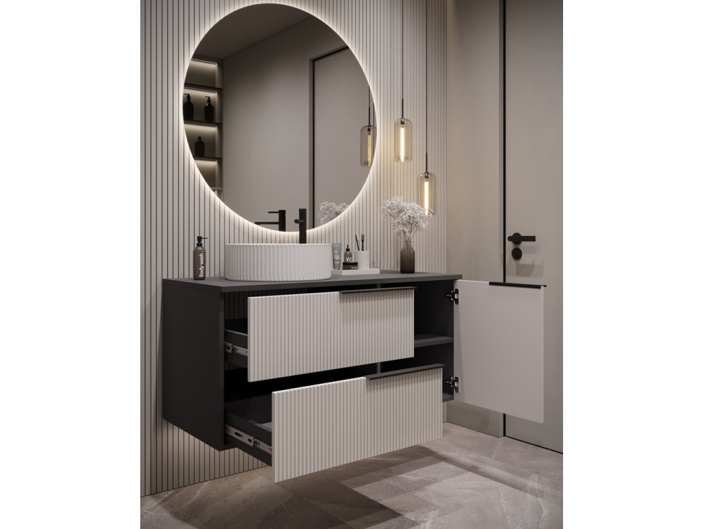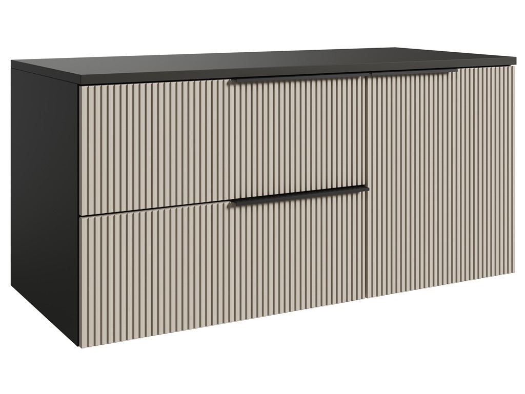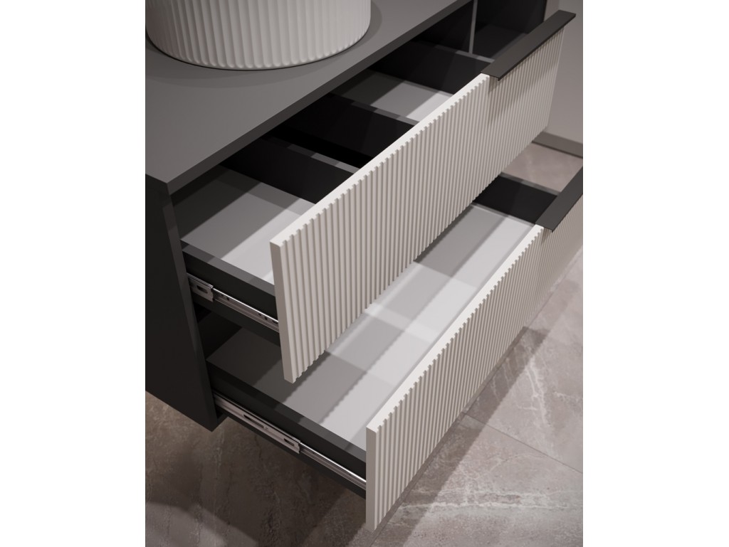 Szafka Kler 100 to elegancki mebel łazienkowy w kolorze antracyt/kaszmir, łączący nowoczesny design z funkcjonalnością. Ryflowane fronty w odcieniu kaszmiru zestawiono z matowym korpusem w antracycie, tworząc harmonijny kontrast. Dwie pojemne szuflady i wisząca konstrukcja ułatwiają organizację przestrzeni i utrzymanie czystości. ⟵Zobacz całą kolekcję mebli Kler