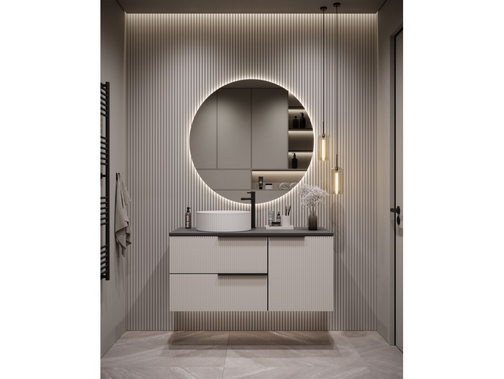 Ryflowane fronty w kolorze kaszmiru ocieplają łazienkę, a głęboki antracyt dodaje eleganckiego kontrastu.
