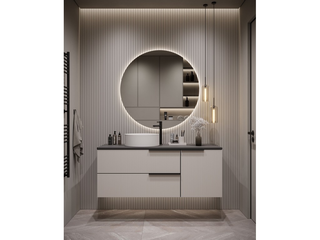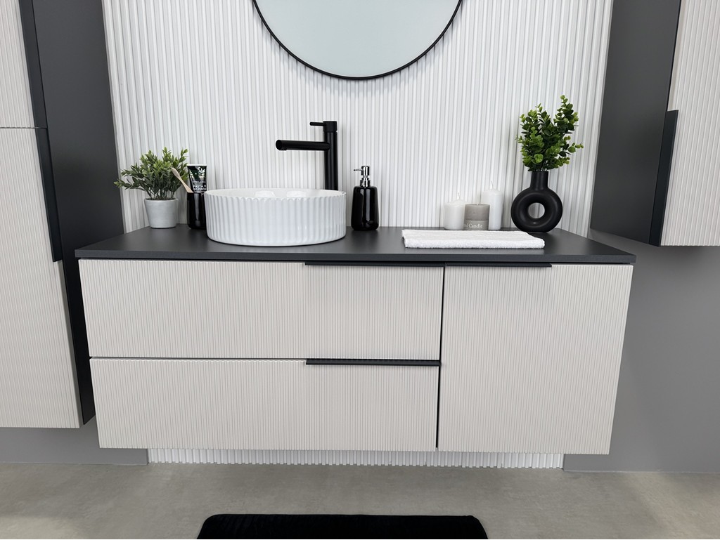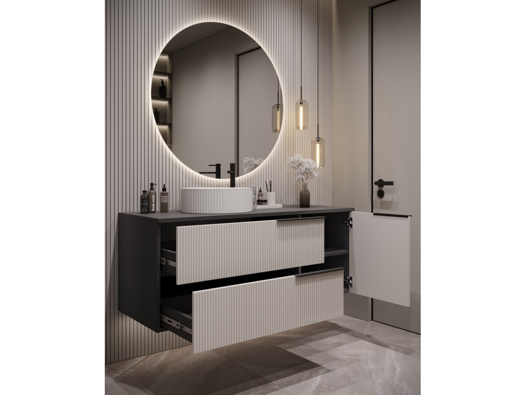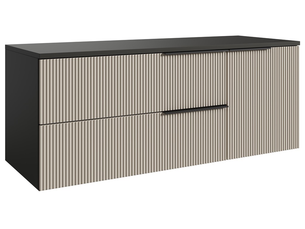 Szafka łazienkowa Kler 120 w kolorze antracyt/kaszmir łączy elegancki wygląd z funkcjonalnością. Ryflowane fronty w ciepłym odcieniu kaszmiru kontrastują z ciemnym korpusem, tworząc efekt przestronności. Duża szerokość i pojemne szuflady sprawiają, że szafka doskonale sprawdzi się w przestronnych łazienkach, a montaż wiszący ułatwia utrzymanie czystości. ⟵Zobacz całą kolekcję mebli Kler