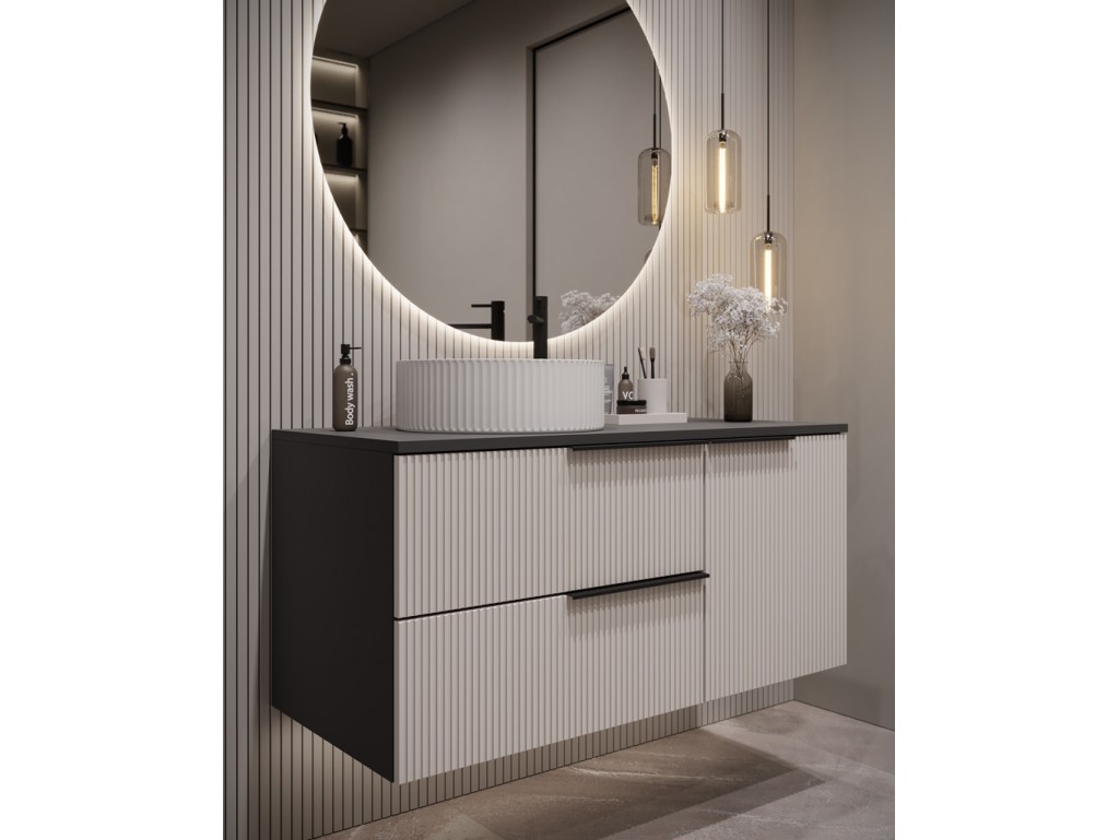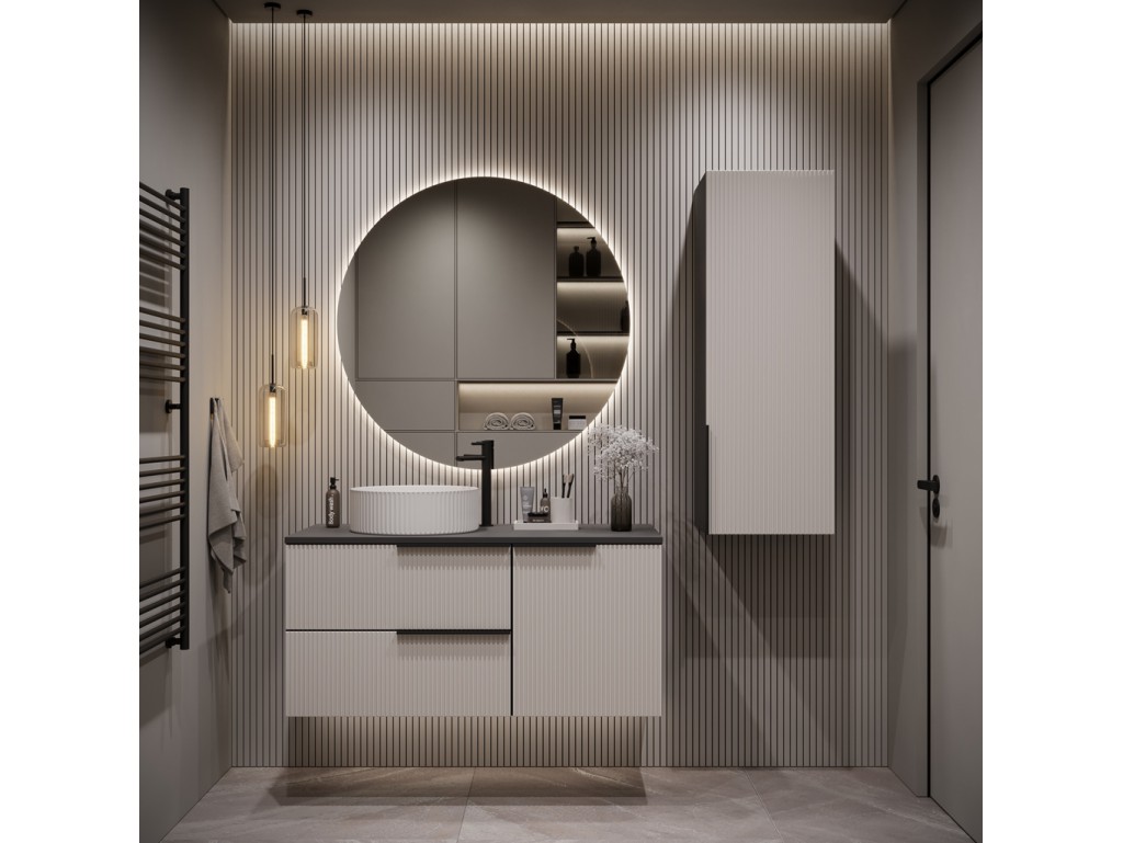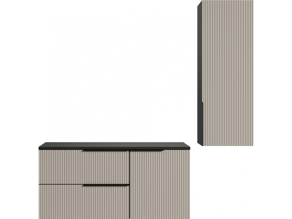 Ryflowane fronty kaszmir ocieplają wnętrze, a szerokość 100 cm szafki daje przestrzeń nawet przy rodzinnym użytkowaniu.