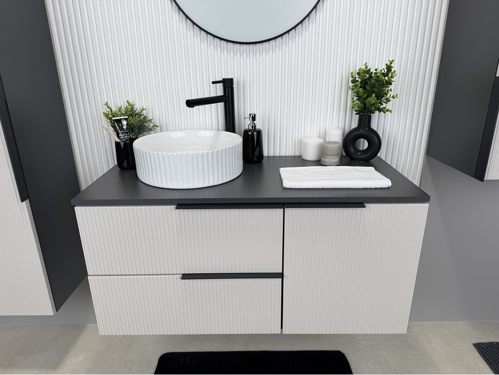 Zestaw Kler 100 1 to eleganckie i funkcjonalne rozwiązanie do średniej wielkości łazienek. Szafka 100 cm i słupek 100 cm w kolorze antracytu z ryflowanymi frontami kaszmir wprowadzają ciepło i wyrafinowany styl. Blat w zestawie umożliwia szybki montaż umywalki, a konstrukcja wisząca ułatwia utrzymanie porządku. ⟵Zobacz całą kolekcję mebli Kler