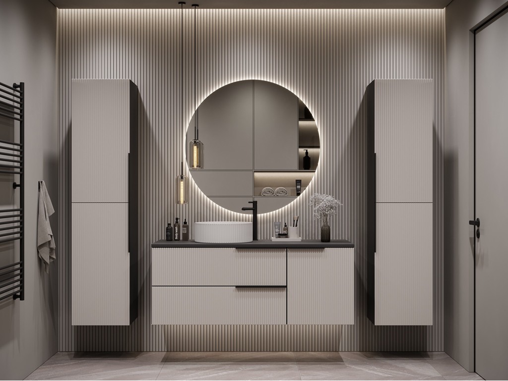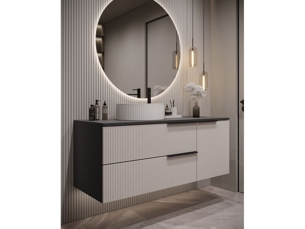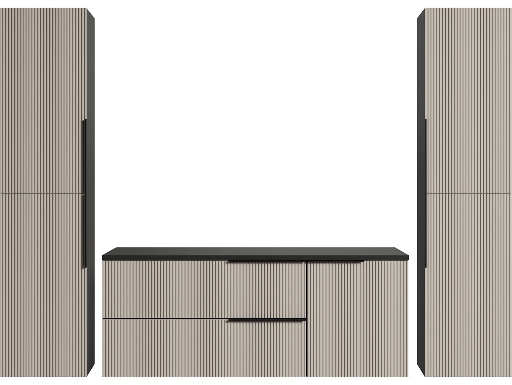 Ryflowane fronty dodają głębi i elegancji, a połączenie antracytu z kaszmirem wprowadza subtelny kontrast.