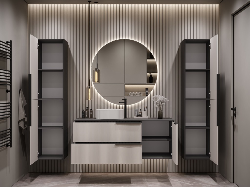 Zestaw Łazienka Kler 120 5 to komplet dla wymagających użytkowników, łączący dużą szafkę 120 cm z dwoma słupkami 150 cm. Połączenie antracytowego korpusu z kaszmirowymi frontami tworzy elegancki i nowoczesny wystrój łazienki, zapewniając jednocześnie dużą pojemność i praktyczność. Dostawa jest szybka i bezpłatna, w ciągu 3-10 dni roboczych. ⟵Zobacz całą kolekcję mebli Kler
