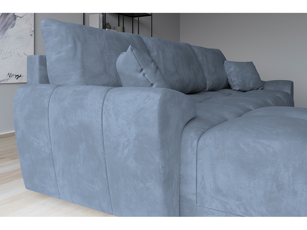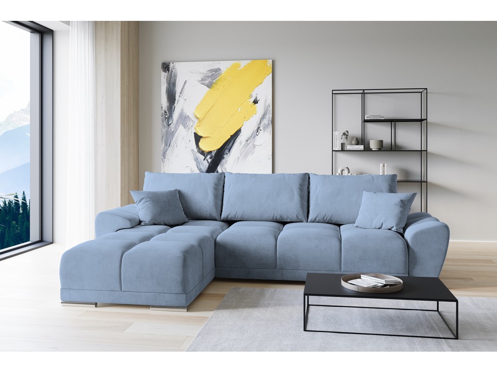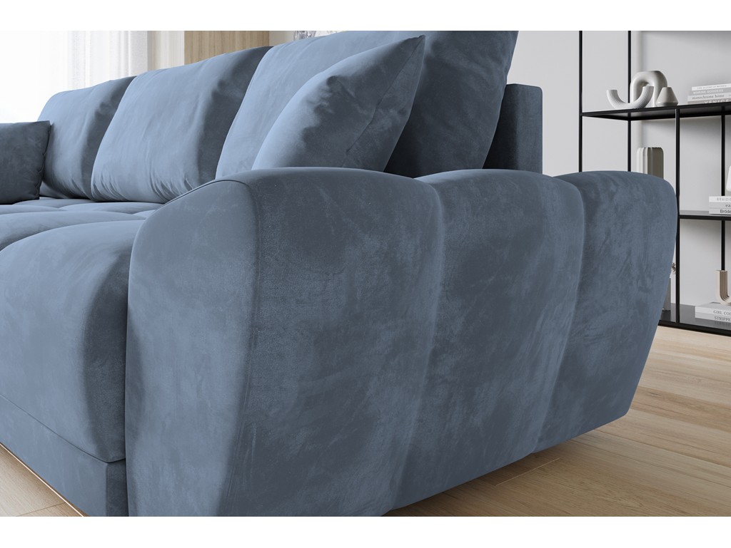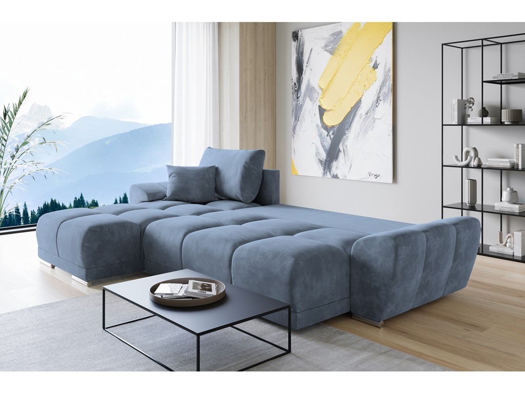 Szaro-niebieski welur wprowadza spokojny ton i elegancję, a funkcja spania pozwala łatwo przekształcić narożnik w łóżko dla gości.