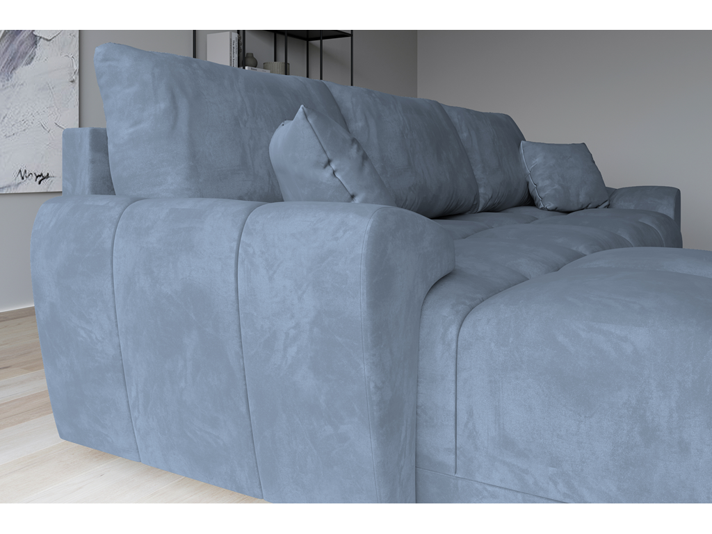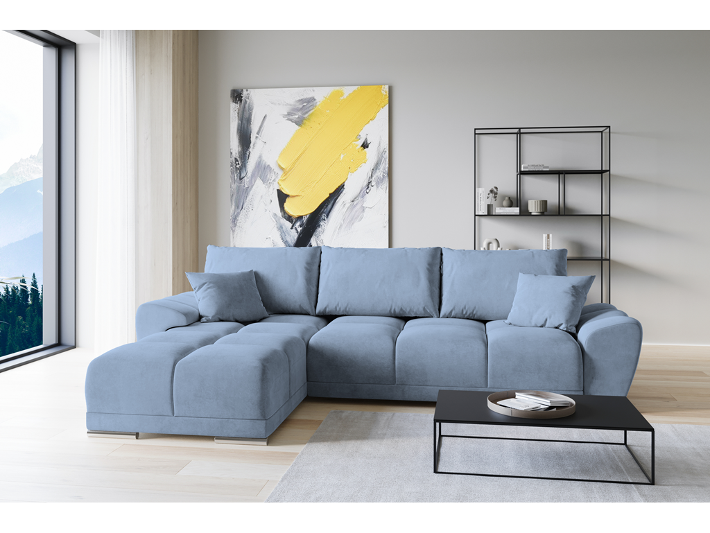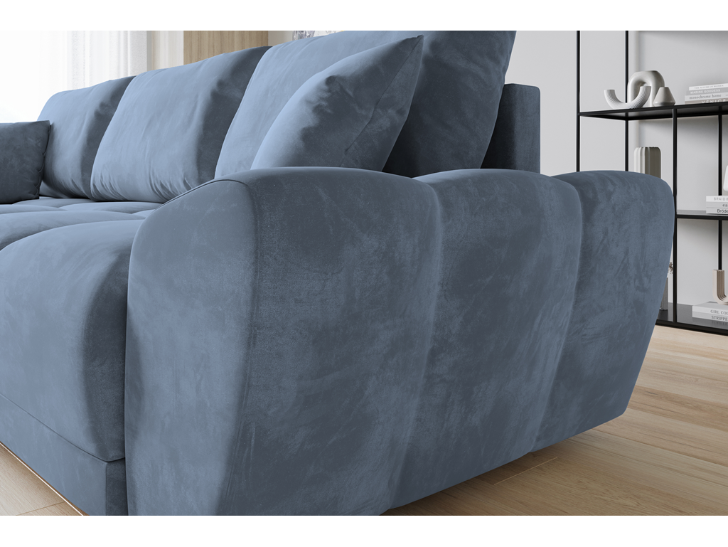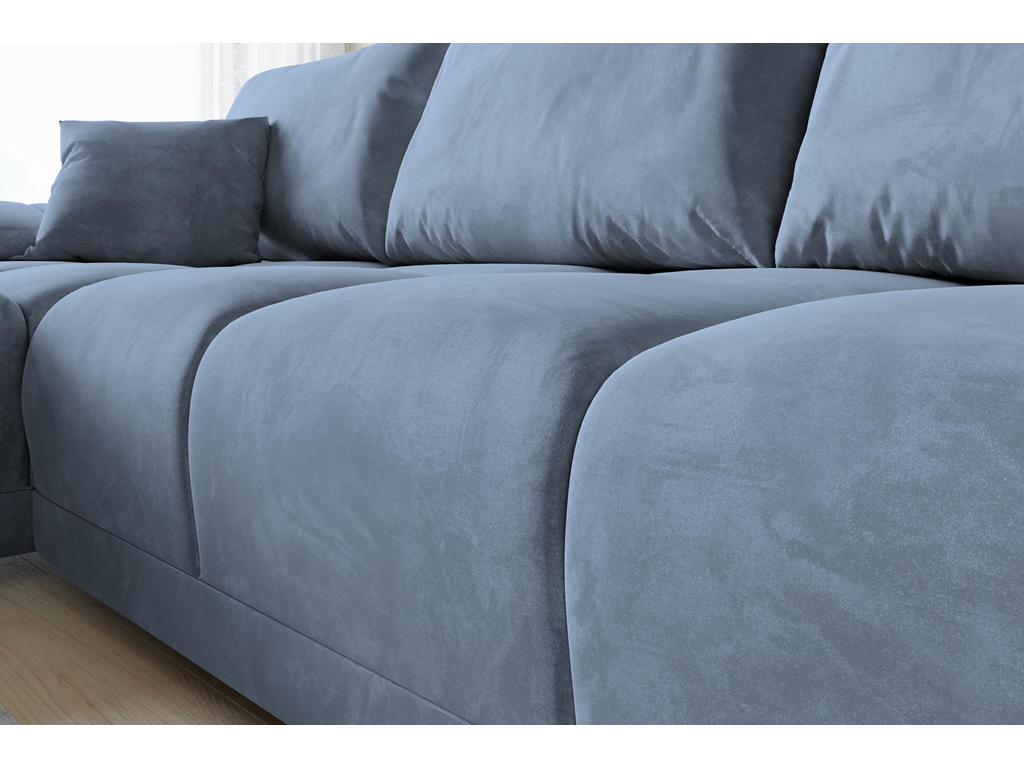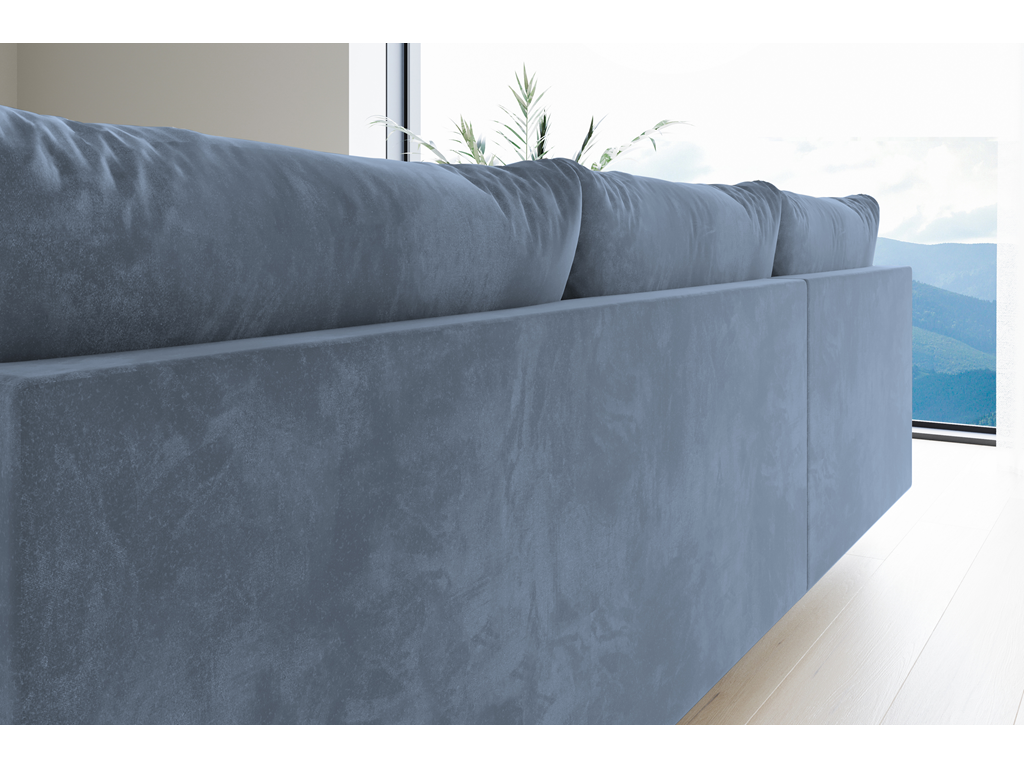 Model Bego L MO-70 wprowadza do salonu subtelny kolor szaro-niebieskiego weluru, który doskonale łączy się z drewnem i jasnymi ścianami.