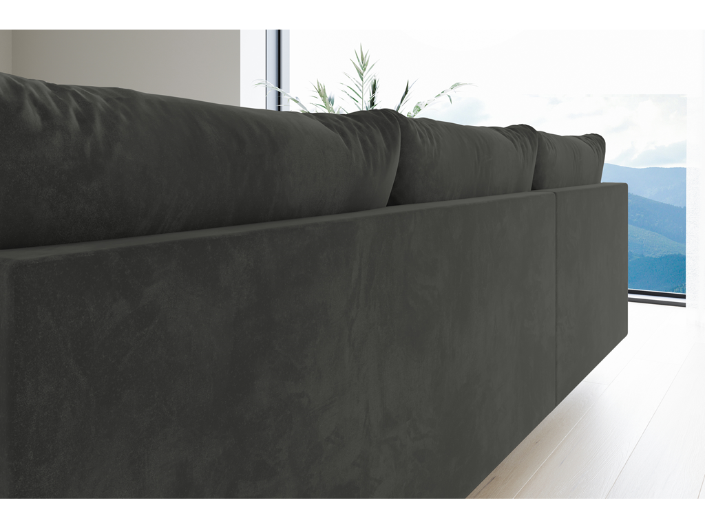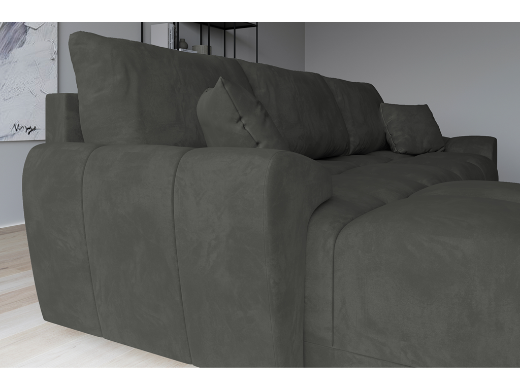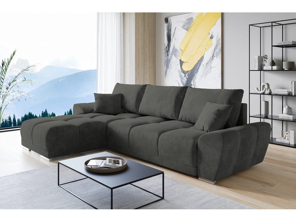 Popielaty welur nadaje wnętrzu lekkości i spokoju, a funkcja spania i pojemnik czynią z narożnika idealny wybór do wypoczynku i przyjmowania gości.