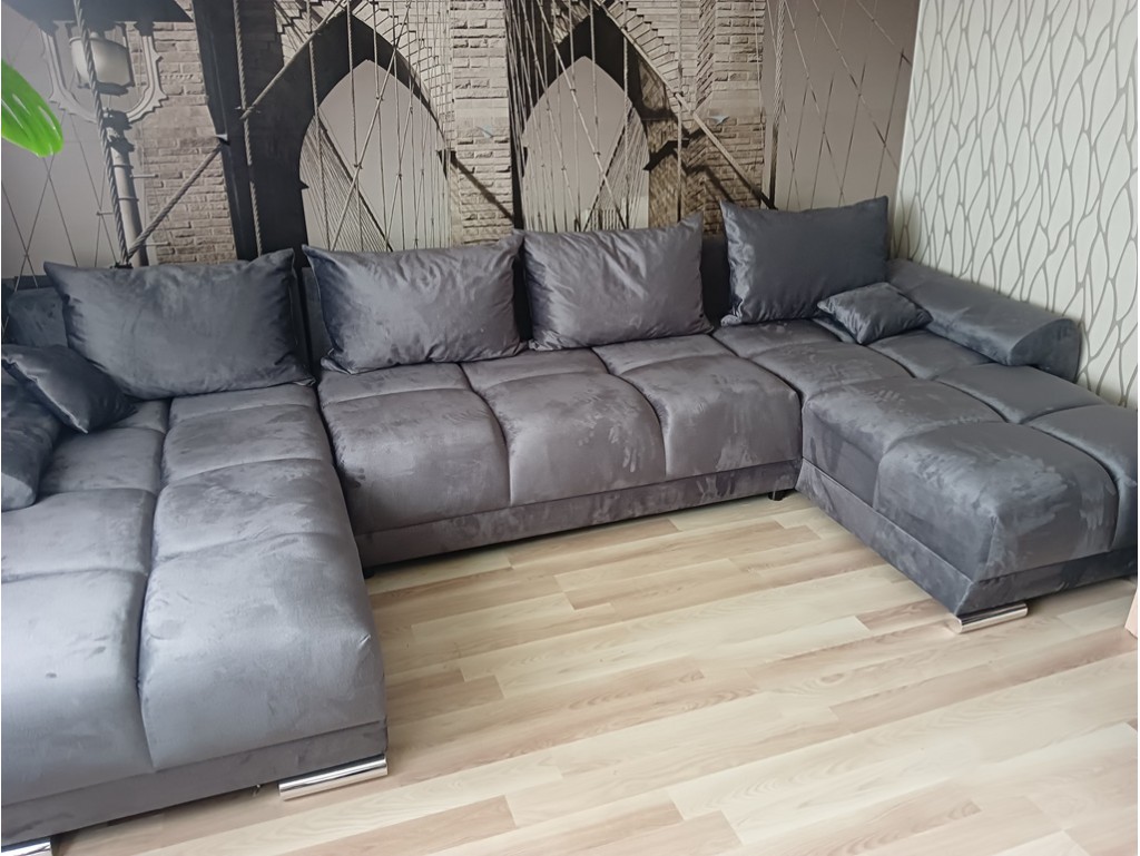 Jego kształt w formie litery U sprawia, że doskonale wypełnia przestronne wnętrza salonu, tworząc miejsce do relaksu i spotkań.