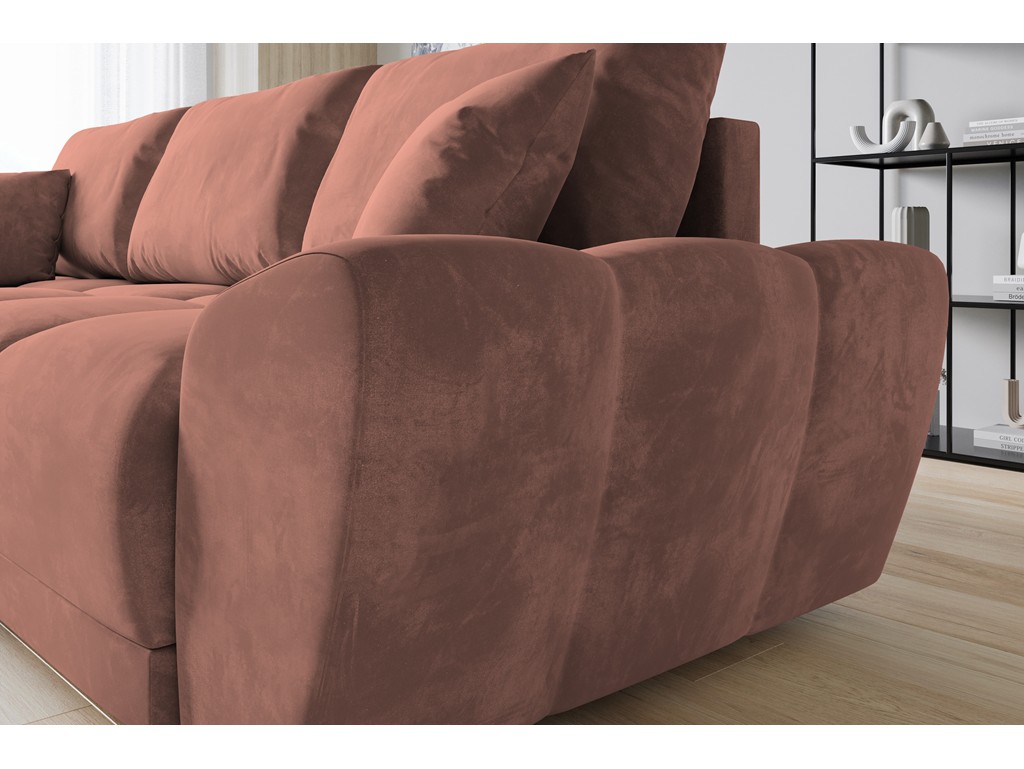 Ergonomiczna konstrukcja zapewnia wygodę podczas codziennego odpoczynku, a tkanina welurowa łączy elegancję z praktycznością.