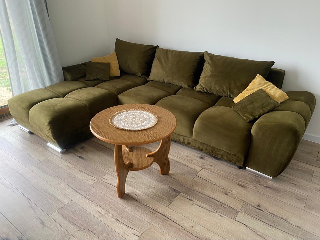 Oliwkowy ton weluru idealnie łączy się z drewnem i neutralnymi ścianami, tworząc spójną, przytulną przestrzeń.